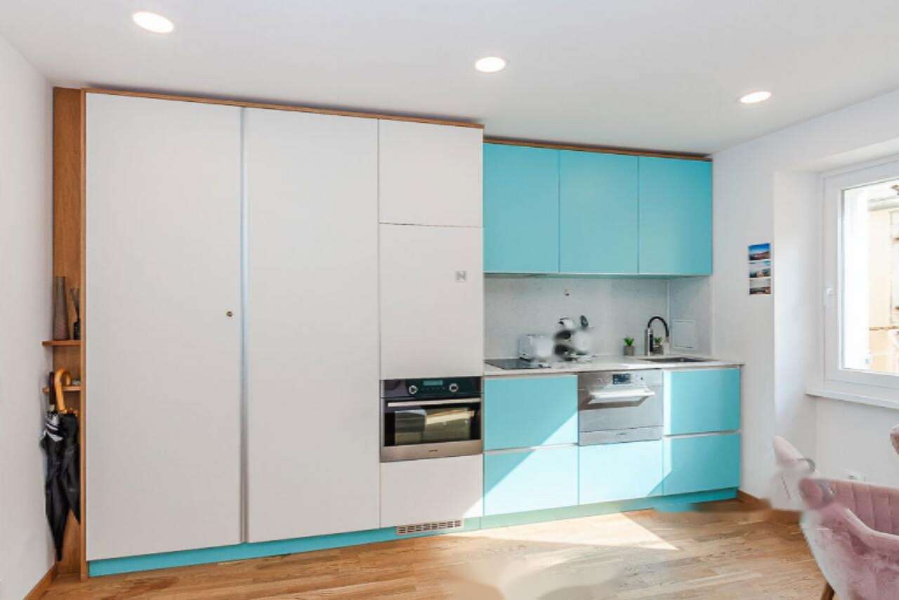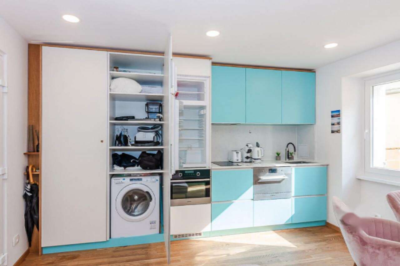 Главное достоинство данного жилья — изысканный и тщательно спроектированный дизайн интерьера, продуманный до мельчайших деталей. Просторное жилое пространство объединено с кухонной зоной и оформлено мебелью на заказ, что обеспечивает функциональность и комфорт. Комплексная модернизация затронула стены, коммуникации, освещение и напольные покрытия. В ванной комнате с душем и туалетом также был произведён капитальный ремонт. Квартира оснащена современной техникой, включая стирально-сушильную машину, посудомоечную машину, духовку, холодильник, морозильник, плиту, вытяжку, а также разнообразными аксессуарами, среди которых посуда и вешалки.