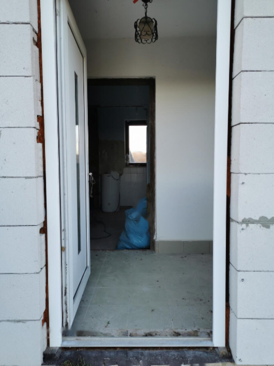 Планировка продумана таким образом, что прихожая ведет в просторную открытую зону, где находятся ванная, объединенная кухня с обеденной зоной и гостиная со спальней. Дом проходит ремонтные работы, окна в нем частично деревянные, частично пластиковые, установлены новые входные двери из ПВХ. Напольные покрытия отсутствуют, крыша покрыта волнистым материалом, фасад еще не завершен, отопление не предусмотрено. Электричество и вода подключены, дом имеет разрешение на строительство, однако адрес еще не присвоен.