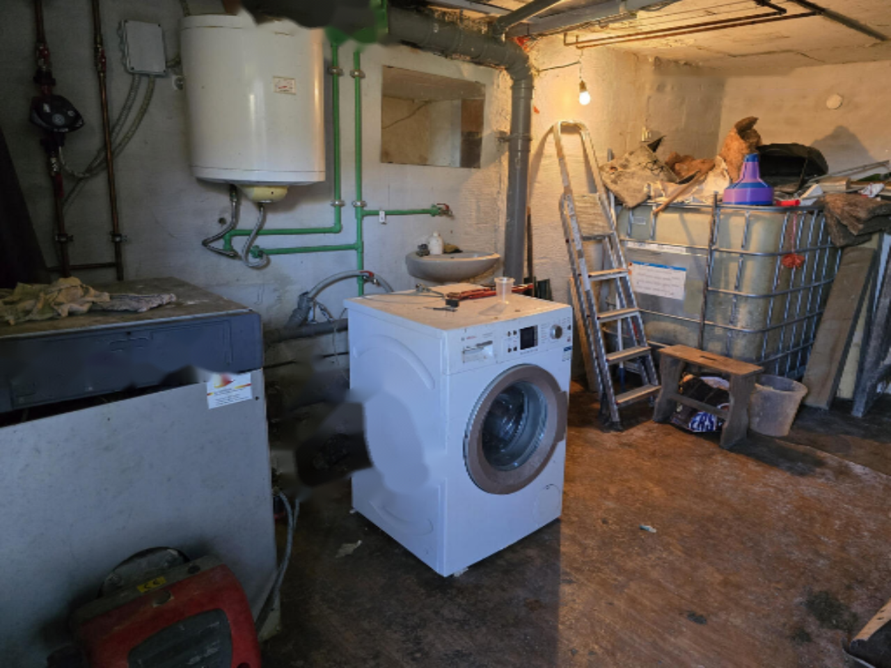 В подвале имеются два помещения: одно, где размещены котел, масляный резервуар (1000 л), водонагреватель и стиральная машина, а другое служит винным погребом. Отопление обеспечивается радиаторами через жидкотопливную печь. Окна, выполненные из ПВХ с жалюзи, были установлены в 2020 году. Крыша покрыта черепицей.
