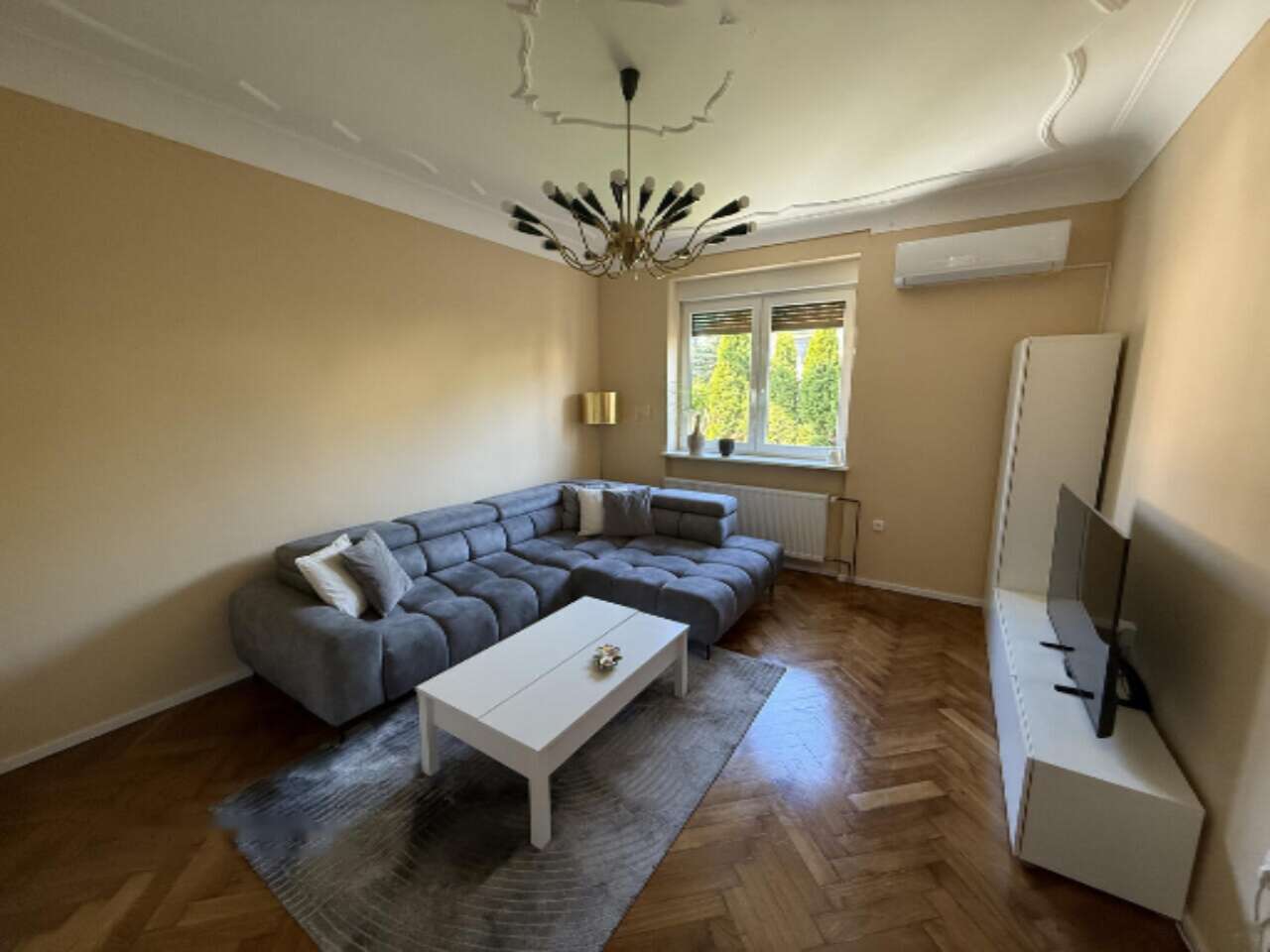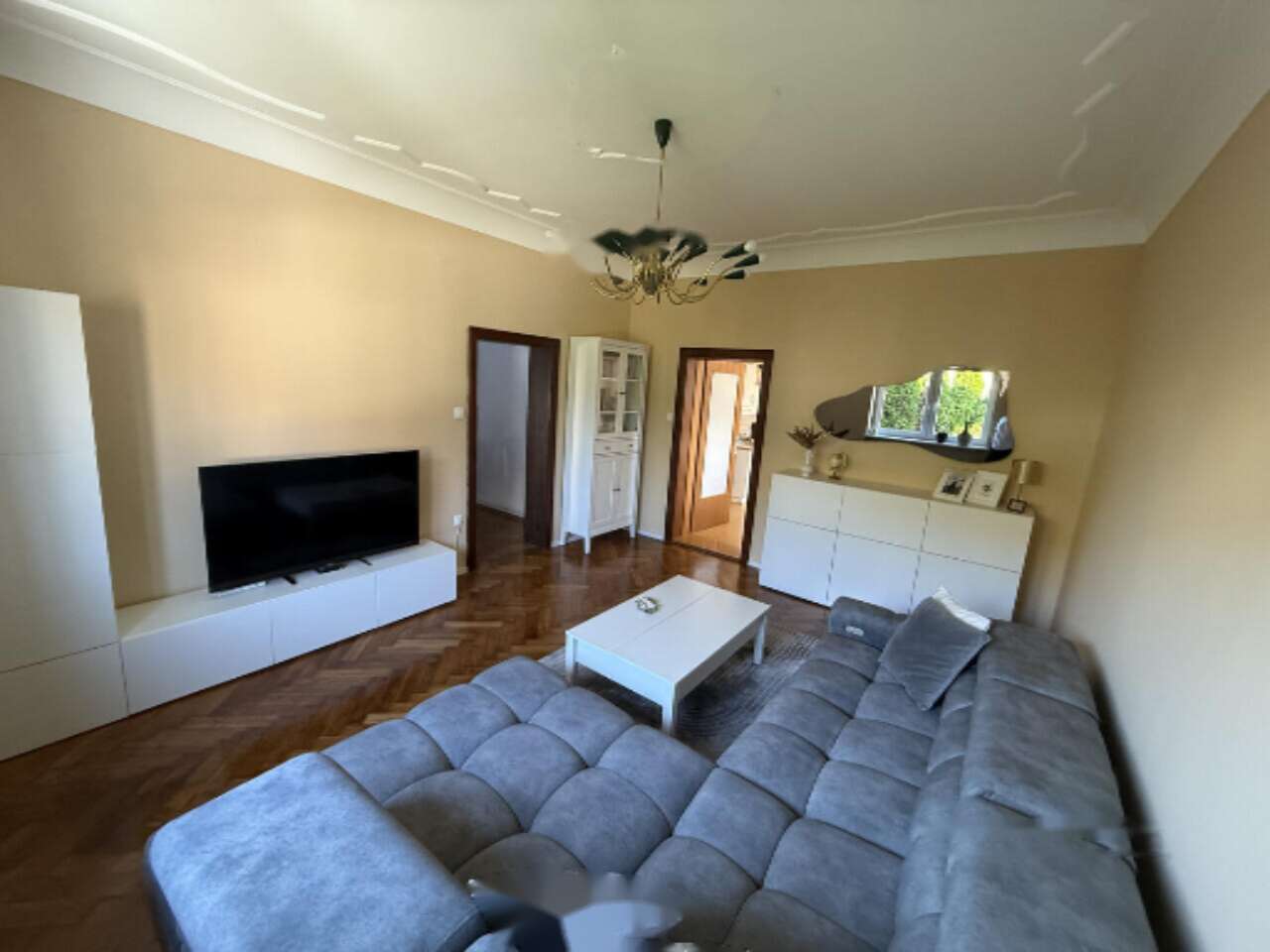 Квартира занимает высоко расположенное цокольное помещение в элегантной городской вилле, возведенной еще в 1936 году. Она привлекает внимание высокими потолками с лепниной и продуманным архитектурным проектом, который дарит жильцам комфорт и уют.