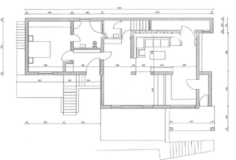 Здание включает в себя подвал, первый и второй этаж. В подвале располагается просторная кантинка, туалет и крытая летняя кухня с дровяной печью. Первый этаж предлагает просторную двухкомнатную квартиру с крытой террасой и каменным столом, а также прихожую, просторную столовую, кухню, гостиную, кладовую, туалет, спальню и ванную комнату. На втором этаже находится более компактное двухкомнатное жилье с гостиной, спальней, ванной и балконом.
