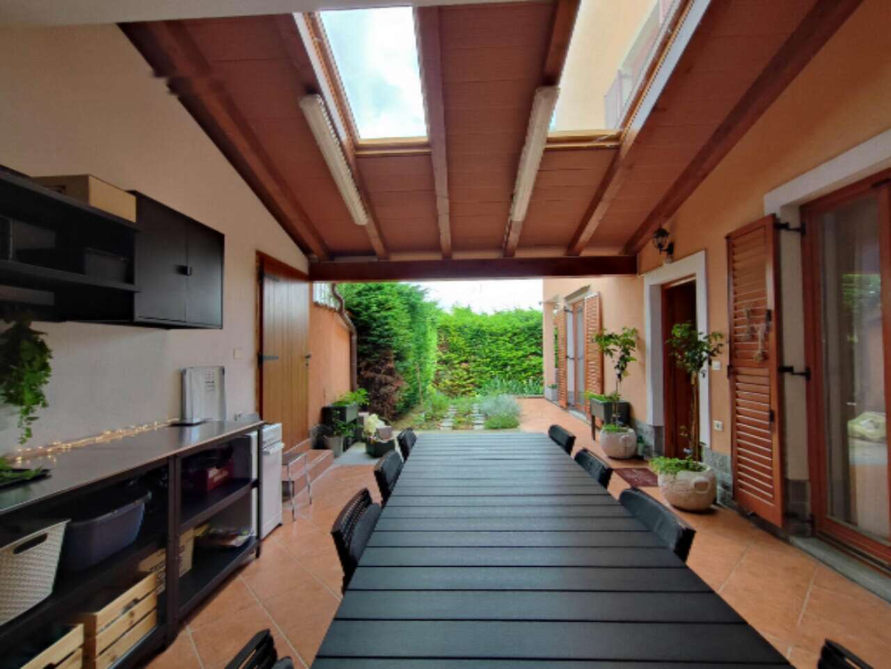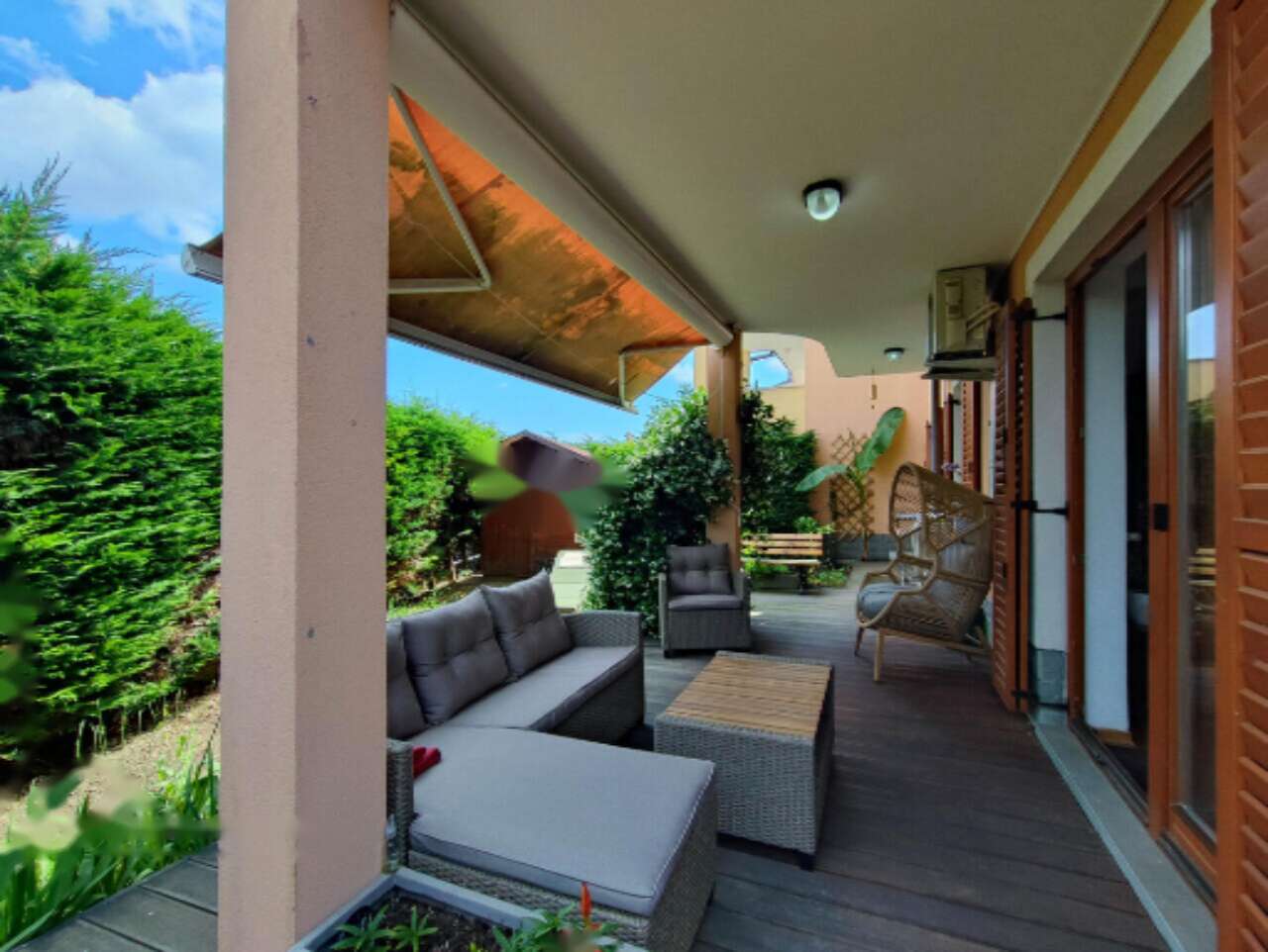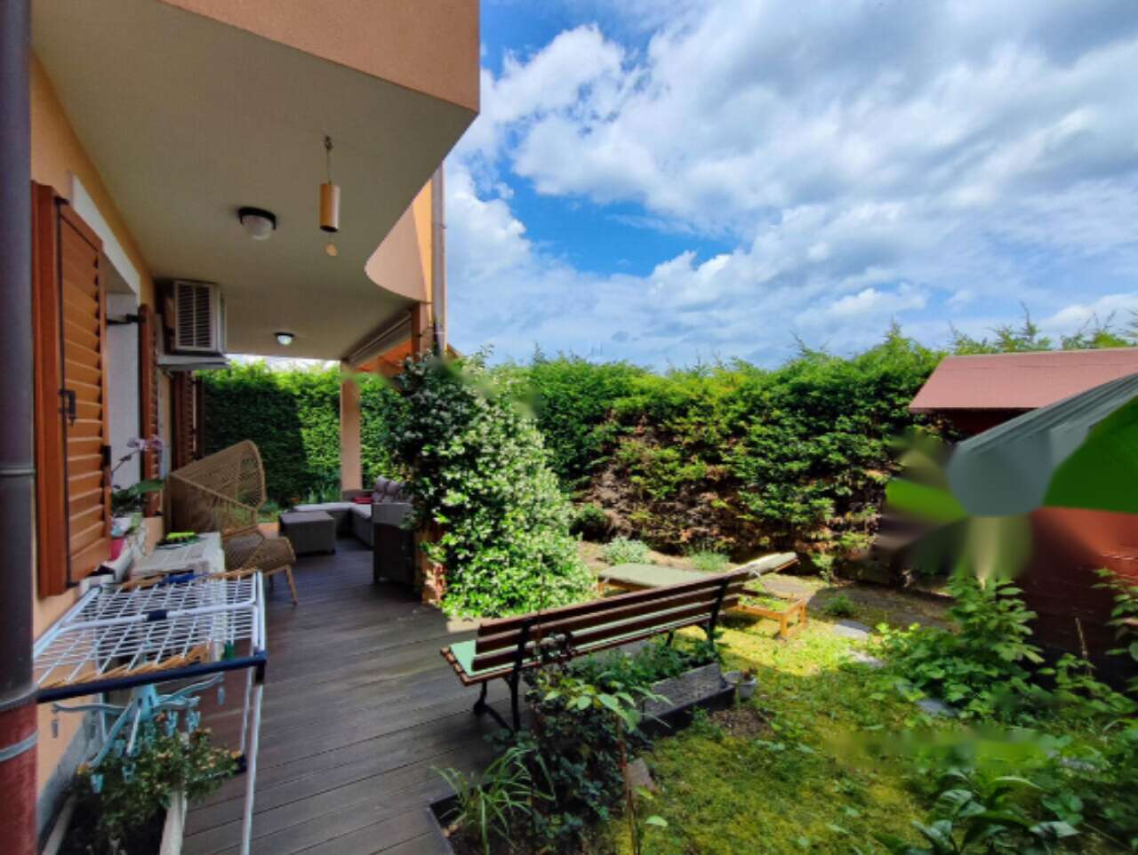 Квартира полностью обставлена мебелью и оборудована всеми необходимыми бытовыми устройствами, что позволяет сразу заселиться и наслаждаться комфортом проживания. Жилое пространство дополняется террасой и уютным внутренним двориком с летней кухней. Также к дому прилегает ухоженный сад размером 146 м² с кладовой для хранения садового инвентаря.