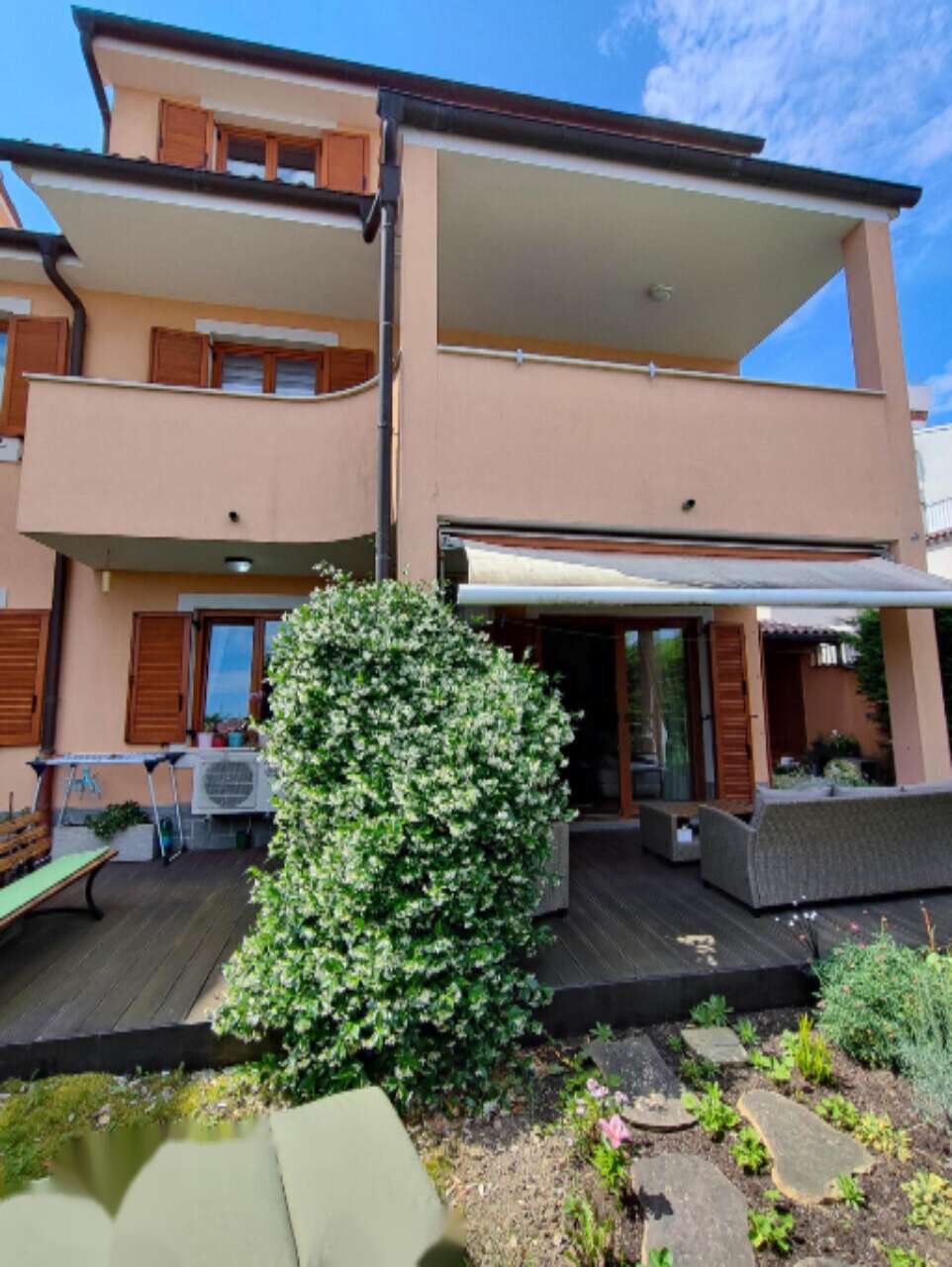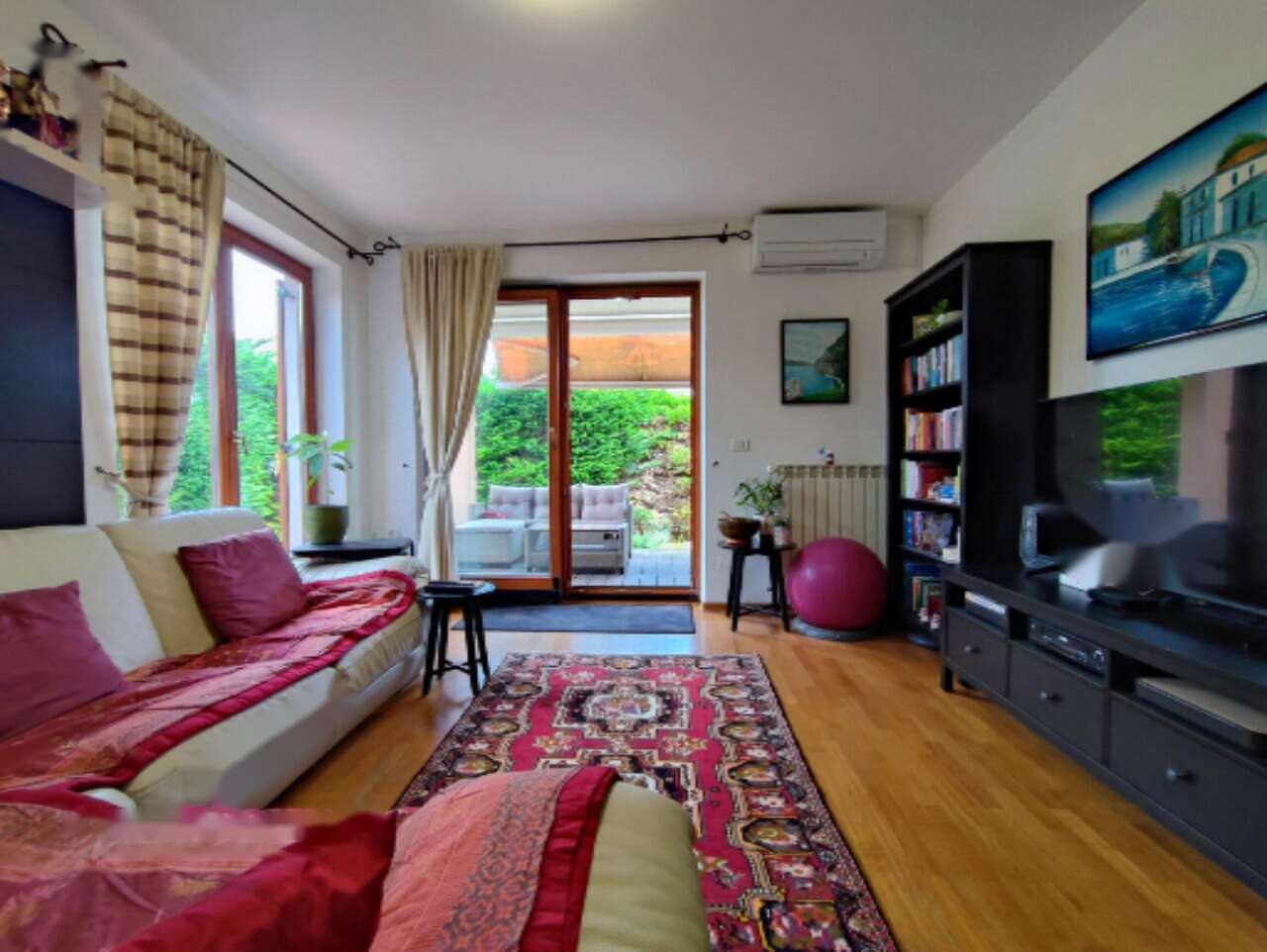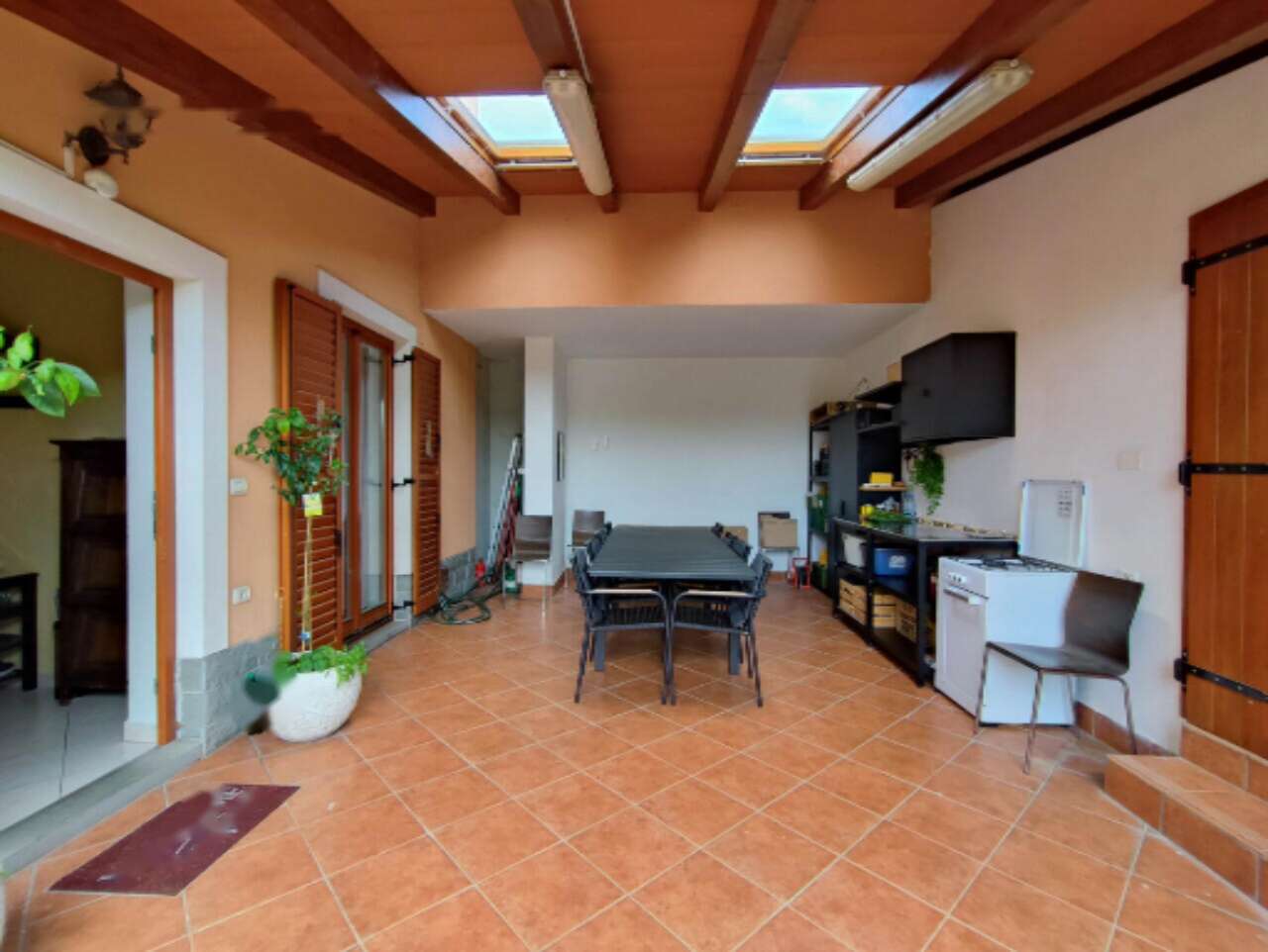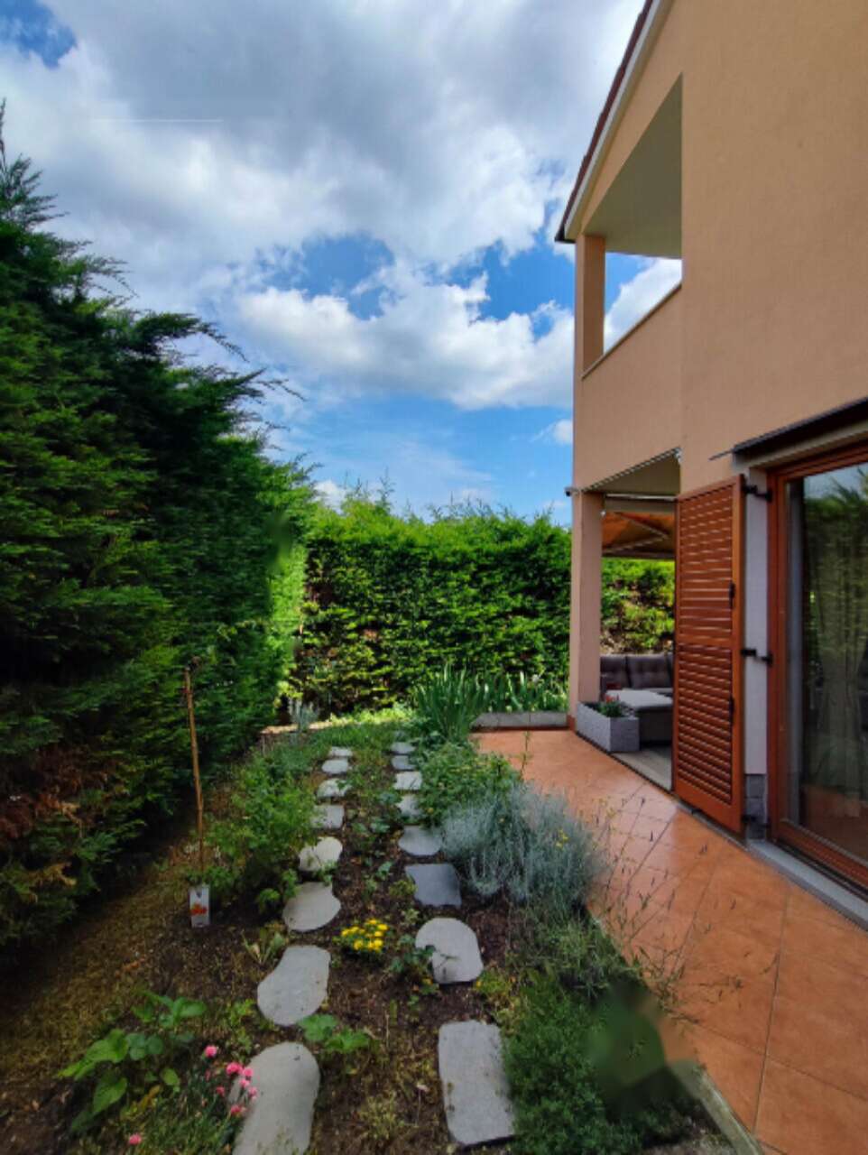 Квартира полностью обставлена мебелью и оборудована всеми необходимыми бытовыми устройствами, что позволяет сразу заселиться и наслаждаться комфортом проживания. Жилое пространство дополняется террасой и уютным внутренним двориком с летней кухней. Также к дому прилегает ухоженный сад размером 146 м² с кладовой для хранения садового инвентаря.