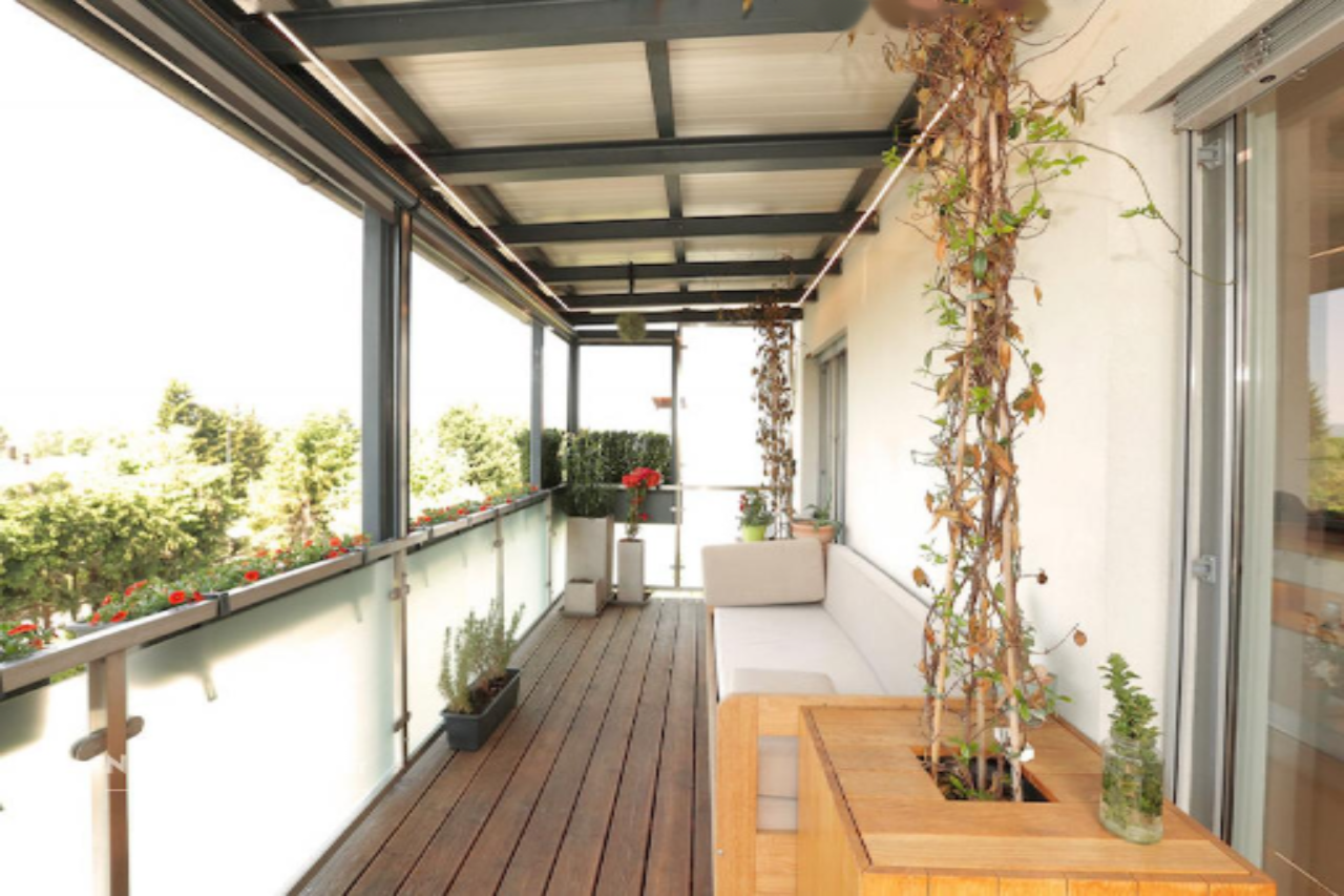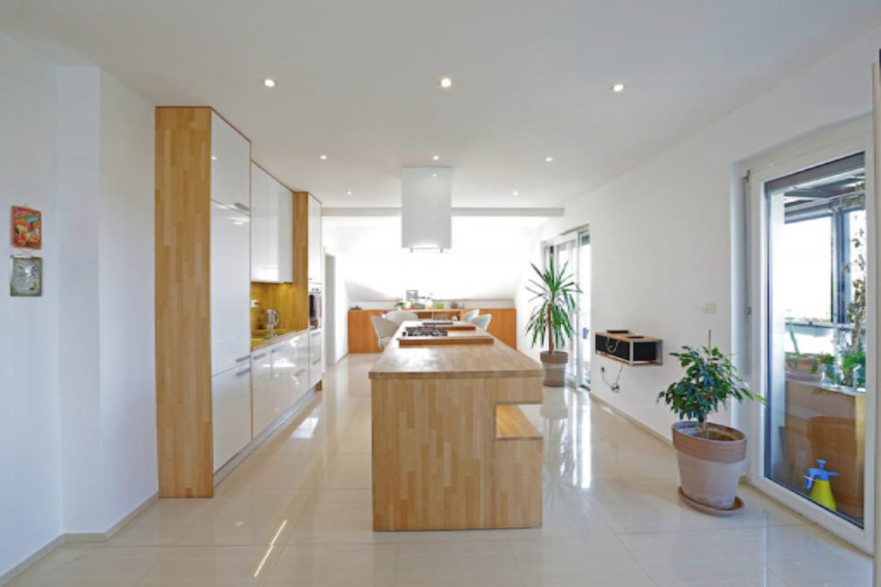 В интерьере, оформленном в современном стиле, предусмотрена мебель, выполненная по индивидуальному заказу, а также разнообразные системе освещения, создающие уникальную атмосферу. Использование террасы, ориентированной на юго-запад, позволяет насладиться захватывающими видами на гору Крим—эта деталь особенно подчеркивает привлекательность жилья.
