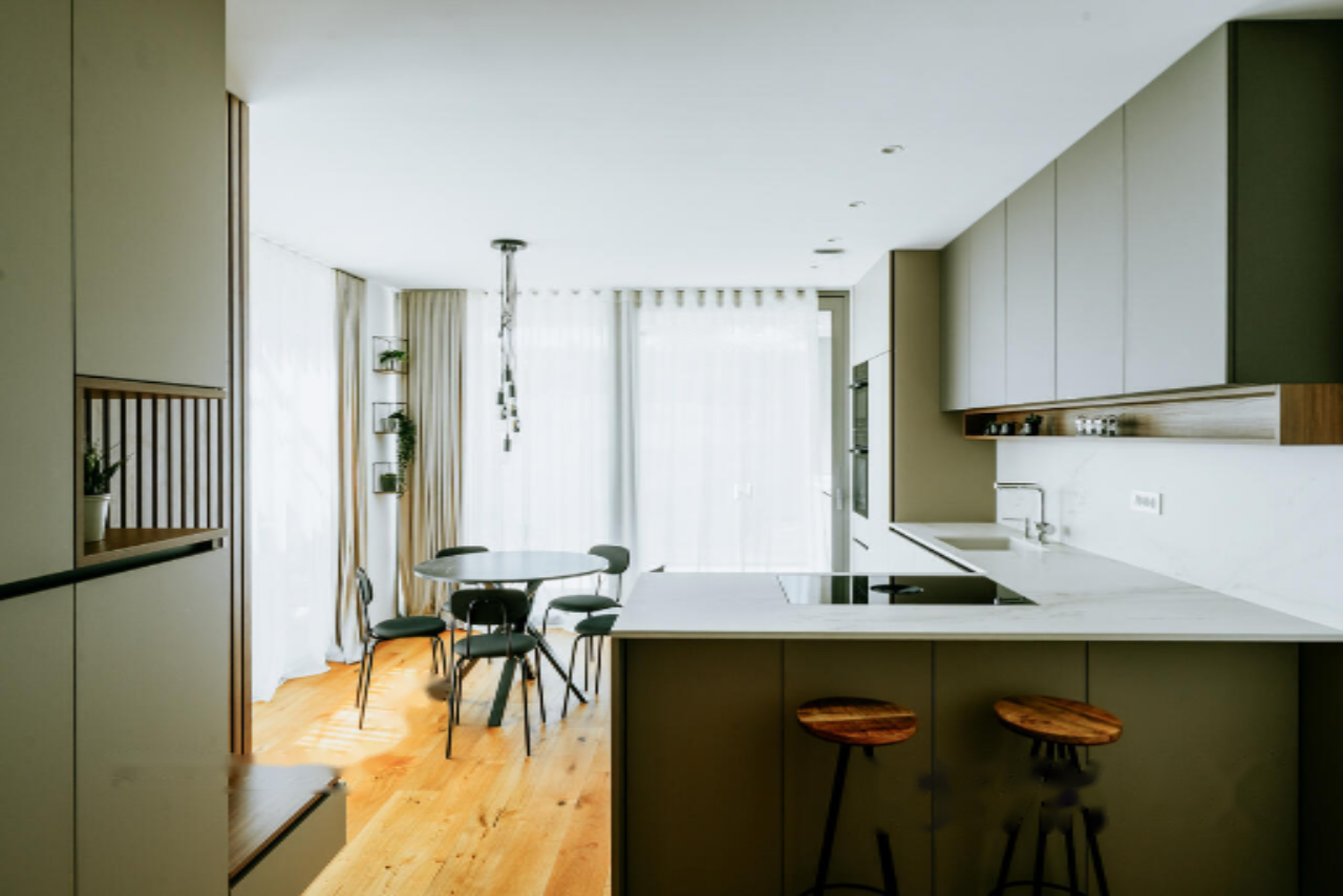 - На балконе установлена наружная кухня с покрытием из Dekton и встроенный гриль.