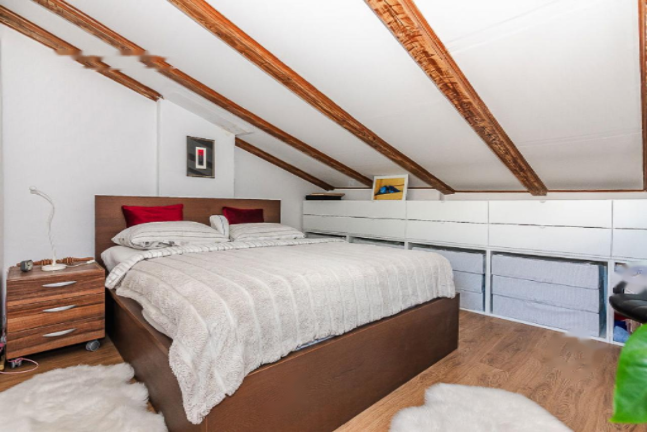 Входной холл на втором этаже ведет к просторной и светлой квартире через лестницу. Слева комната с гардеробной, справа — ванная комната с душем и ванной, а также гостиная-кухня с окнами, выходящими на улицу. Внутренняя лестница поднимает на следующий уровень — мансарду, оборудованную просторной спальней с возможностью установки двуспальной кровати и рабочего пространства. Отсюда выход на террасу с морским видом, которая частично крыта и подходит для отдыха компании из 4-6 человек.