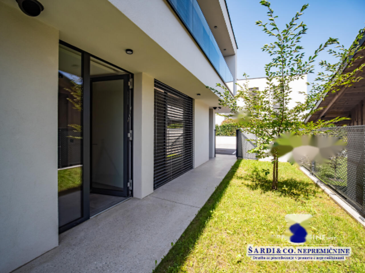 Трёхкомнатная квартира, расположенная на первом этаже, имеет собственную террасу, окружённую зелёными насаждениями, что делает её идеальной для отдыха на открытом воздухе.