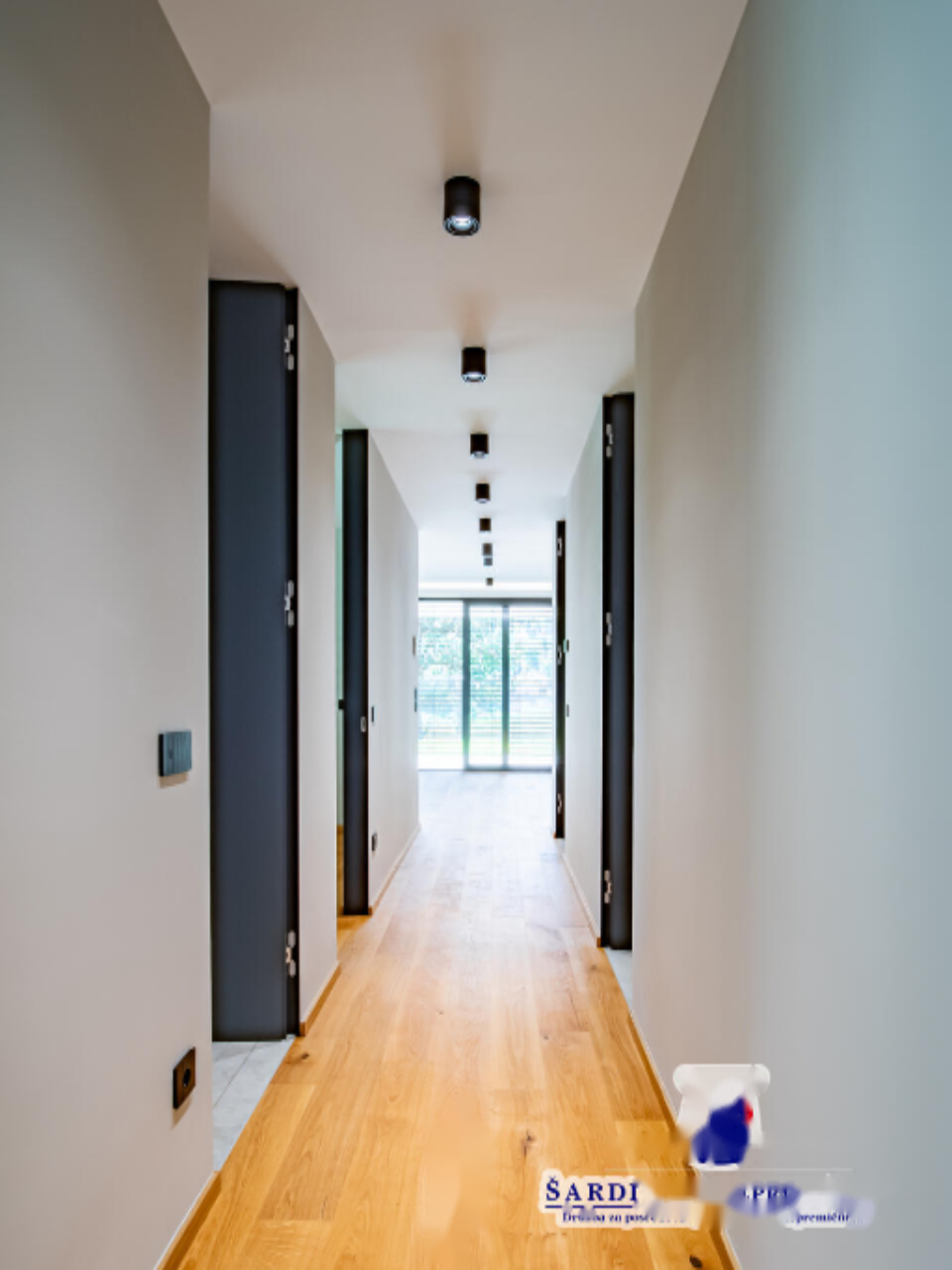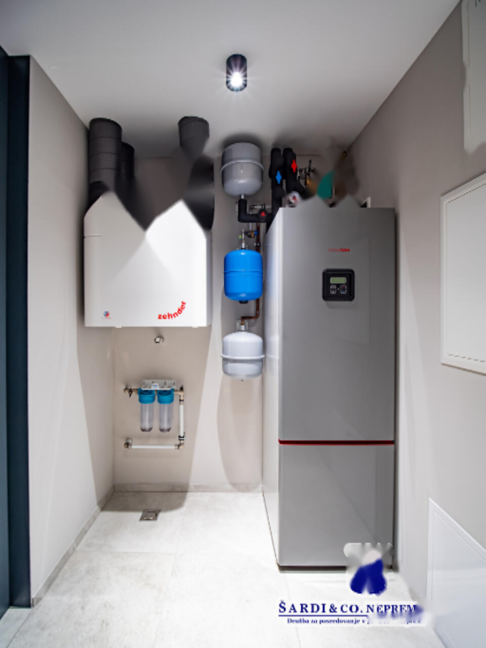Вилла оборудована панорамными окнами с тройным остеклением, электрическими жалюзи, дверями с защитой от взлома и системой доступа по отпечатку пальца, полами из керамики и паркета. Высокий уровень энергоэффективности обеспечивается за счет геотермального теплового насоса, системы напольного отопления, вентиляционной системы с рекуперацией и биологической очистной установки. Обеспечено подключение всех коммуникаций: водоснабжение, электричество, оптические сети и канализация.