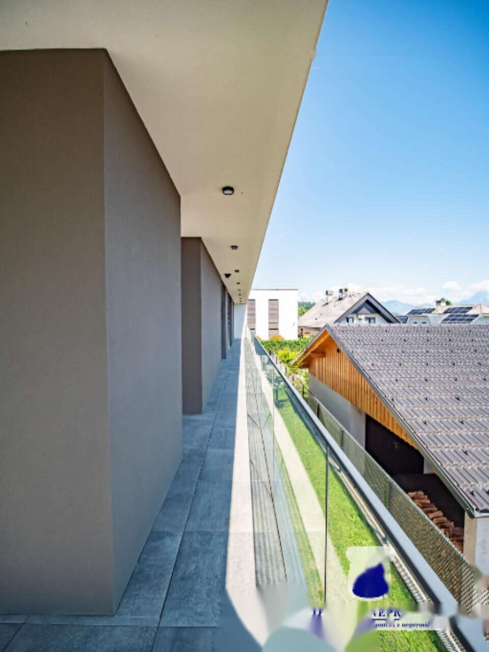Площадь квартиры составляет 239,9 м², включая 145,6 м² полезной площади (112,9 м² жилой и 32,7 м² кладовой) и две обширные террасы площадью 93,7 м² с живописным видом на окрестности. В доме применены современные экологически чистые технологии: геотермальный тепловой насос, система рекуперации воздуха и биологическая очистка сточных вод, обеспечивая высокий уровень комфорта. Уникальными особенностями являются панорамные окна с тройным остеклением, электрически регулируемые жалюзи, усиленные двери с защитой от вторжения и отпечатка пальца, фасад Jubizol, а также высококачественная внутренняя отделка из керамики и паркета.