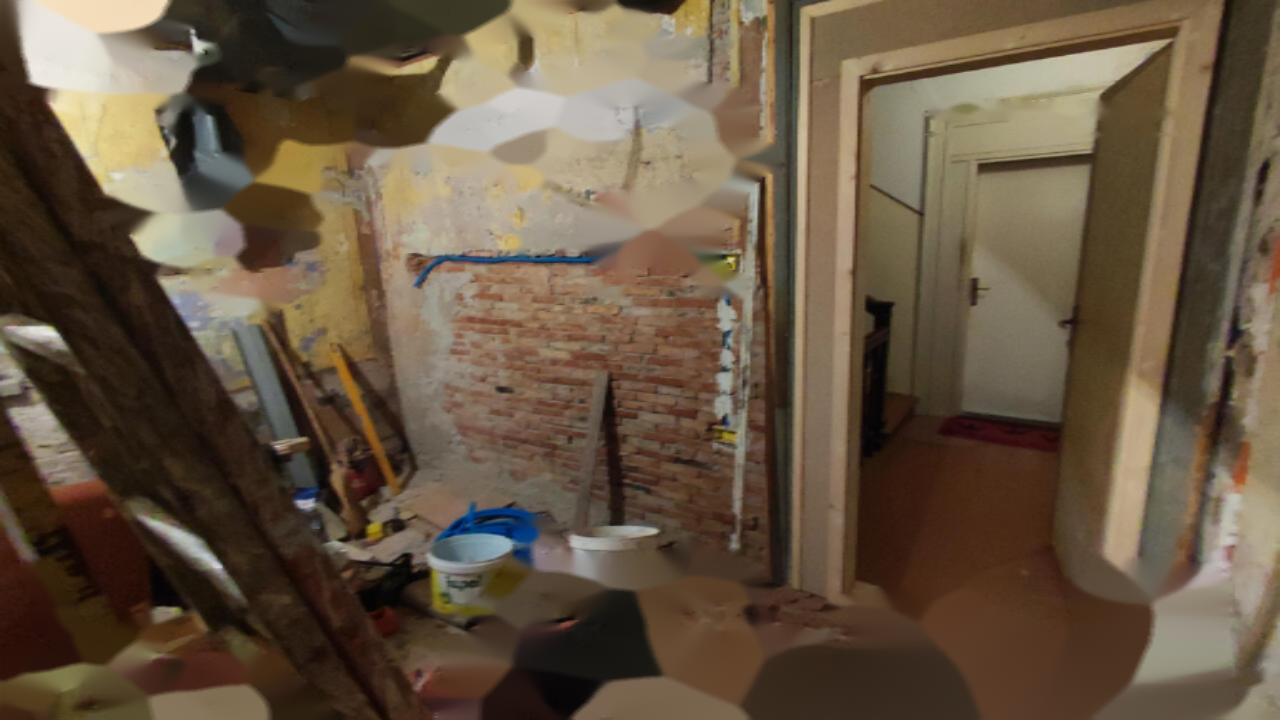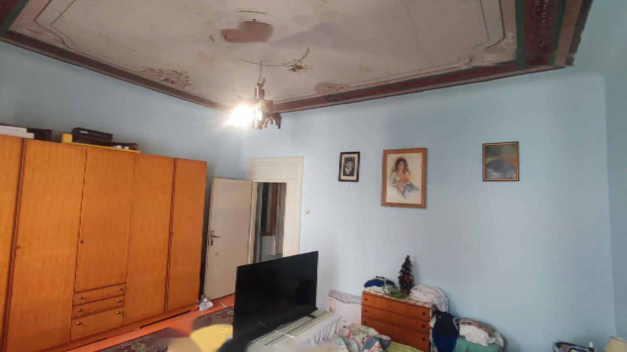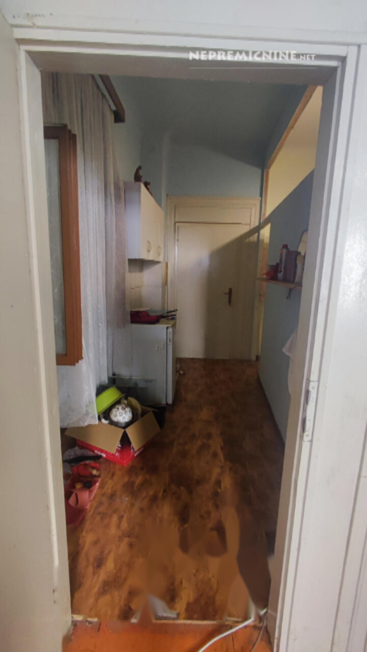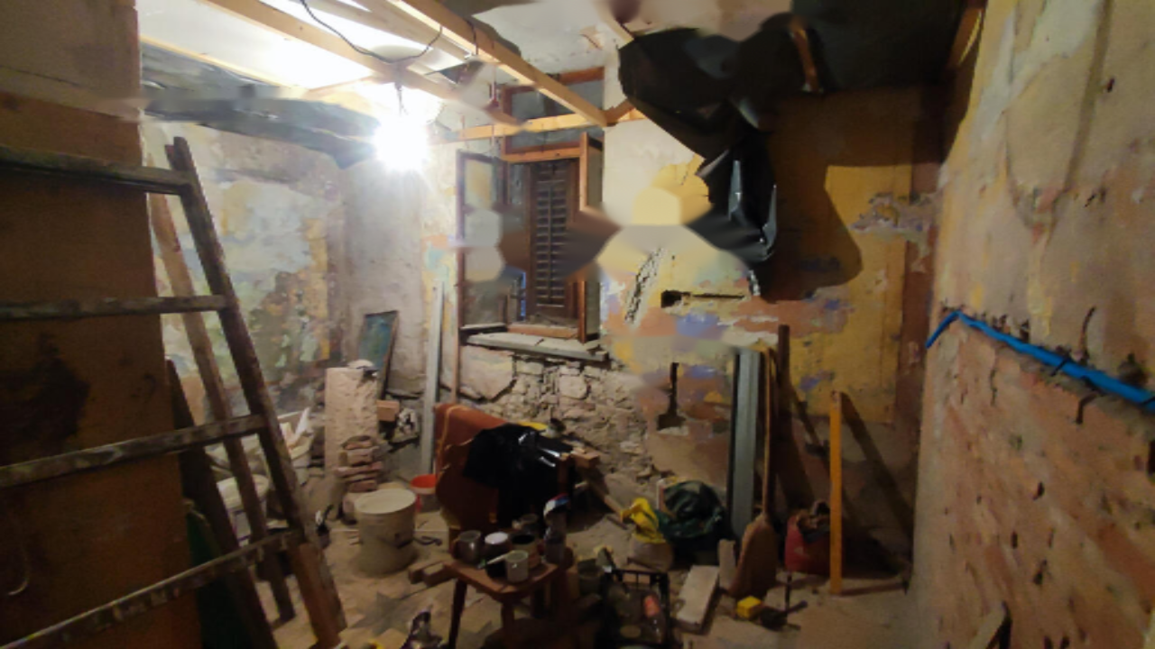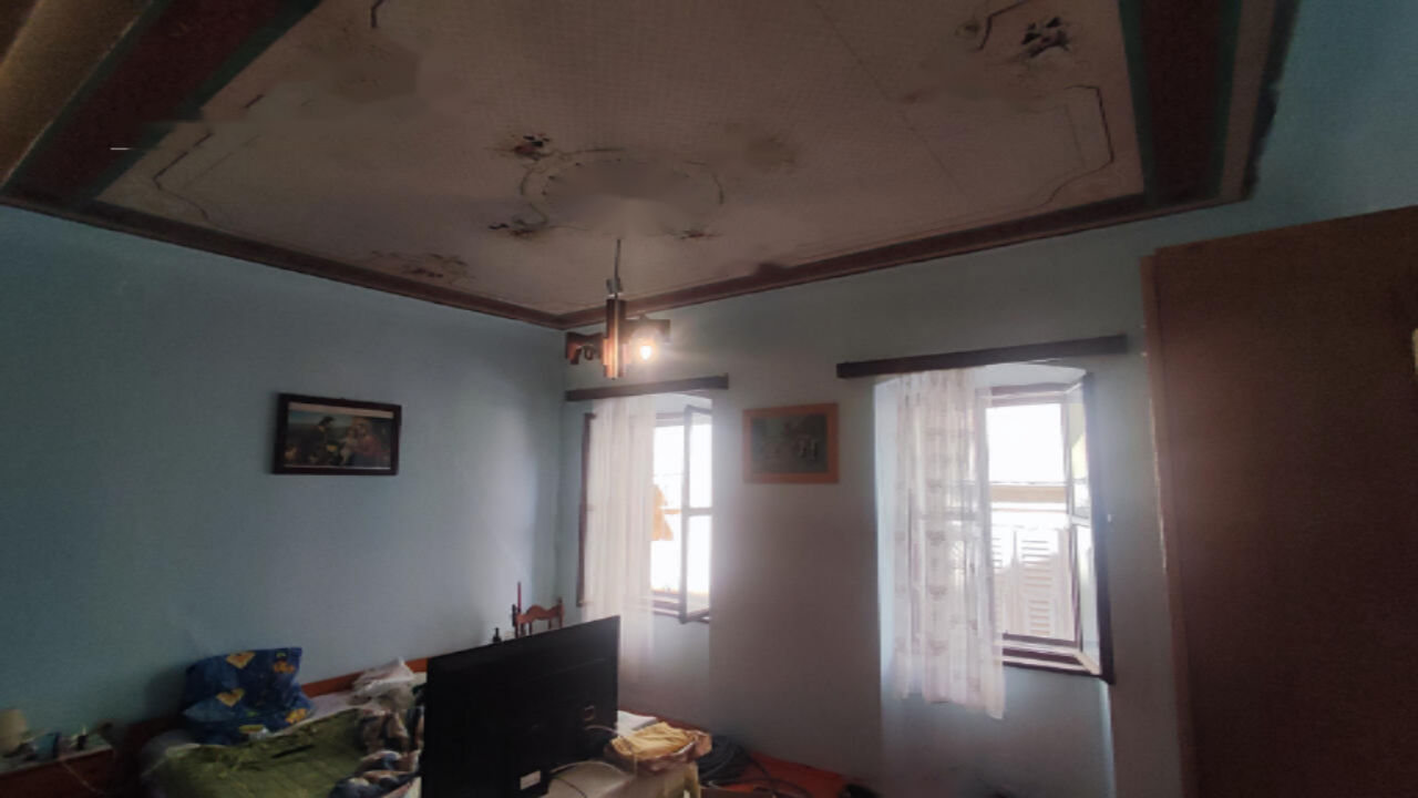 В квартире выделены два крупных сектора: первый включает обновлённую ванную комнату и незавершённую кухню с обеденной зоной. Второй сектор, доступный через совместный коридор, включает главный проход, небольшую комнату и просторный зал с декоративным потолком.