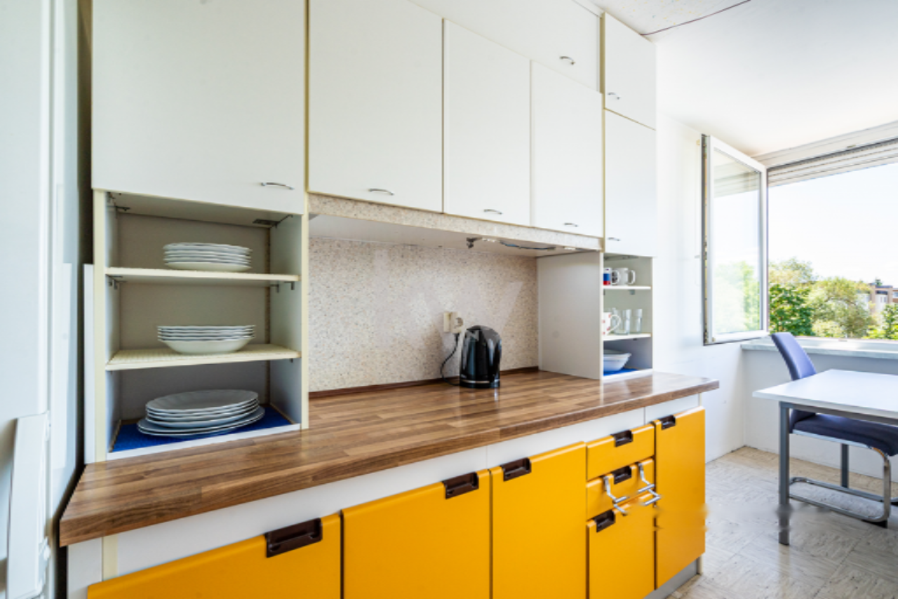 Эта просторная и светлая квартира с двумя спальнями, общей площадью 72,2 м2, расположена на третьем этаже жилого дома в спокойном районе Вич, недалеко от центра Любляны. Построенное в 1979 году и обновлённое в 2000-м, это помещение отличается продуманной планировкой и залито естественным светом благодаря выгодному юго-западному расположению.