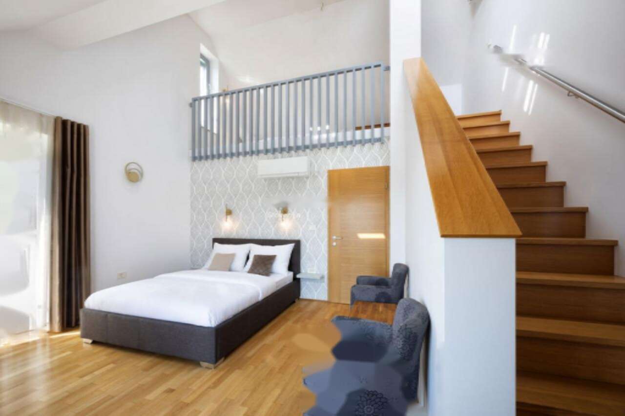 Первый уровень квартиры может похвастаться студио с двуспальной кроватью, инфракрасной сауной, стильной ванной комнатой с большой душевой кабиной и стиральной машиной, а также широкой террасой.