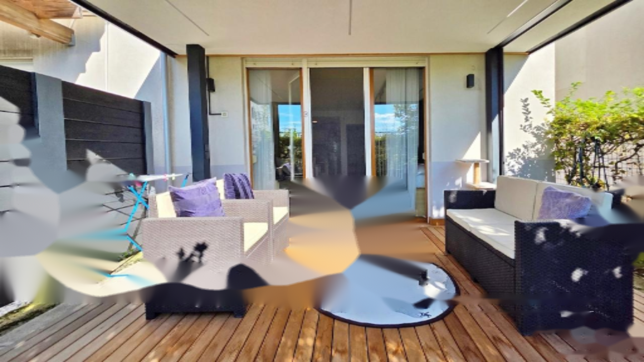 Внутреннее пространство включает кухню с обеденной зоной, совмещенную с гостиной, которая имеет выход на просторную террасу. Гостейная комната разделяется раздвижной дверью, создавая отдельное место для спальни, где легко размещается как двуспальная, так и детская кровати. Дополнительно имеется ванная комната с туалетом и входной коридор. Терраса оборудована перголой и комфортной мебелью для отдыха.