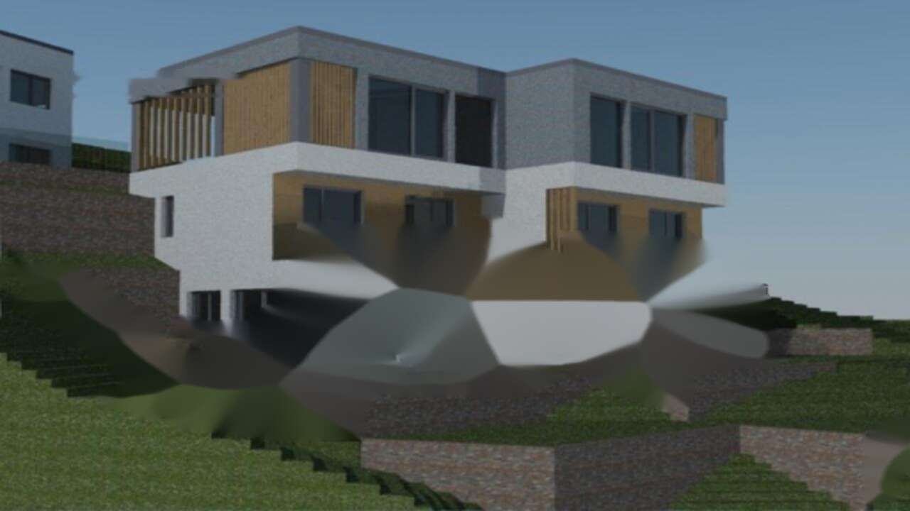 Дневная зона дома ориентирована на юг, а подъезд к строению осуществляется с северной стороны. Удобное местоположение обеспечивает быстрый доступ к магазинам (1,2 км), шоссе (1 км), а также общественному транспорту (400 м до автобусной остановки и 1,4 км до остановки ЛПП 6B).
