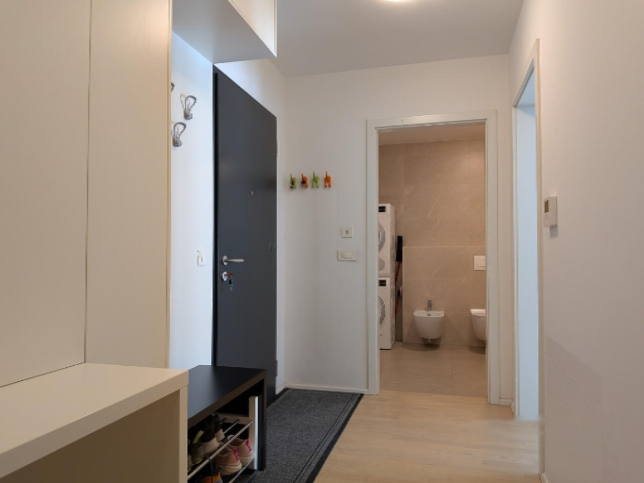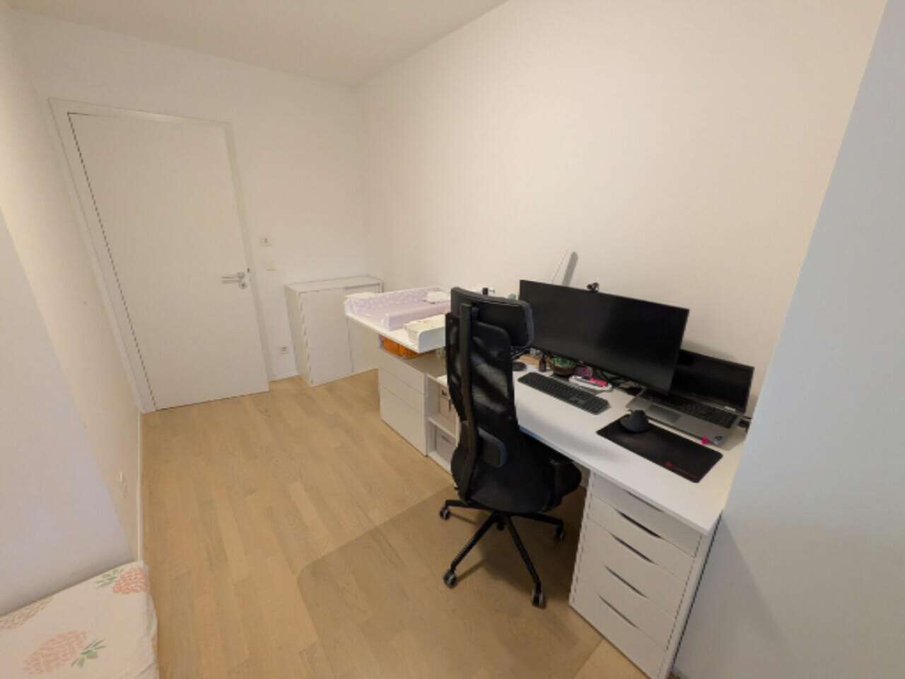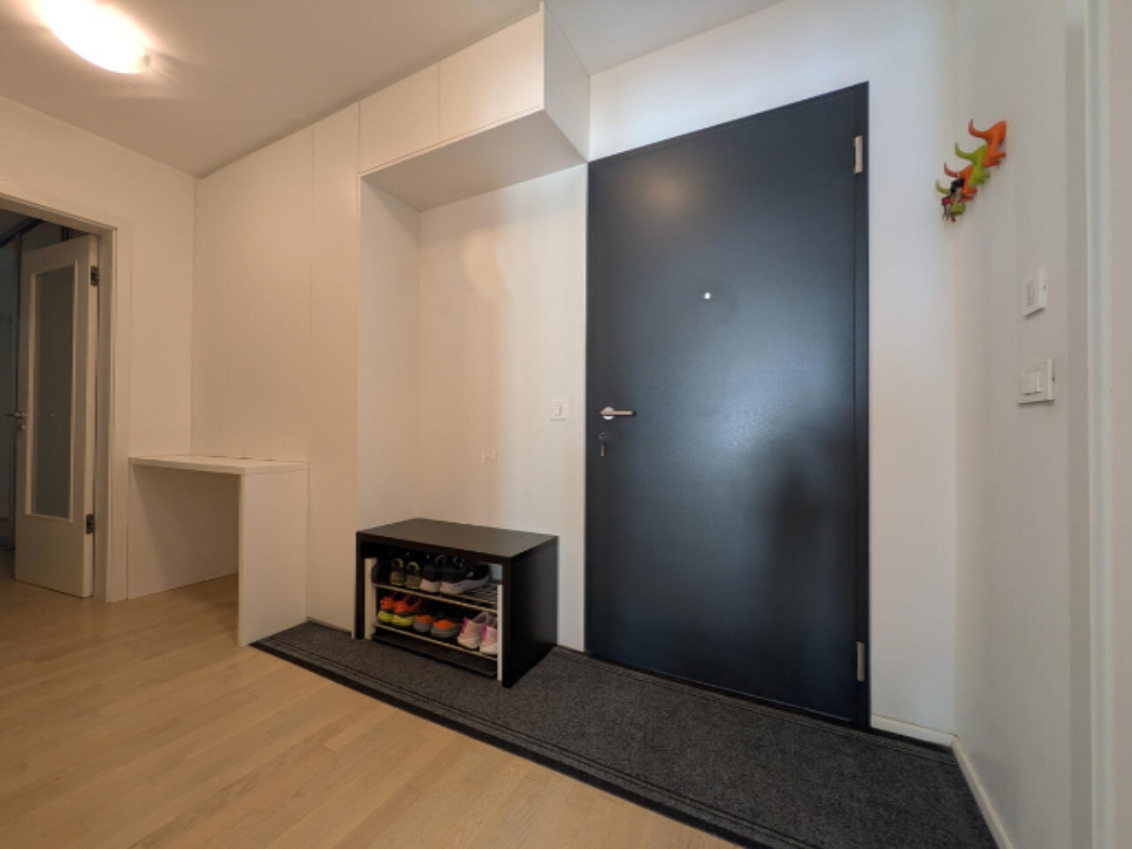 Жилое пространство включает просторную и светлую гостиную и кухню, оснащенную техникой Bosch. Также имеются спальня с встроенным гардеробом, детская комната и ванная с душем, комплектом стиральной и сушильной машин, а также биде. Холл и коридор оформлены встроенными шкафами на заказ. Кроме того, имеется небольшой кабинет с возможностью установки дополнительной ванной комнаты. Великолепная лоджия с кладовой добавляют дополнительную функциональность.