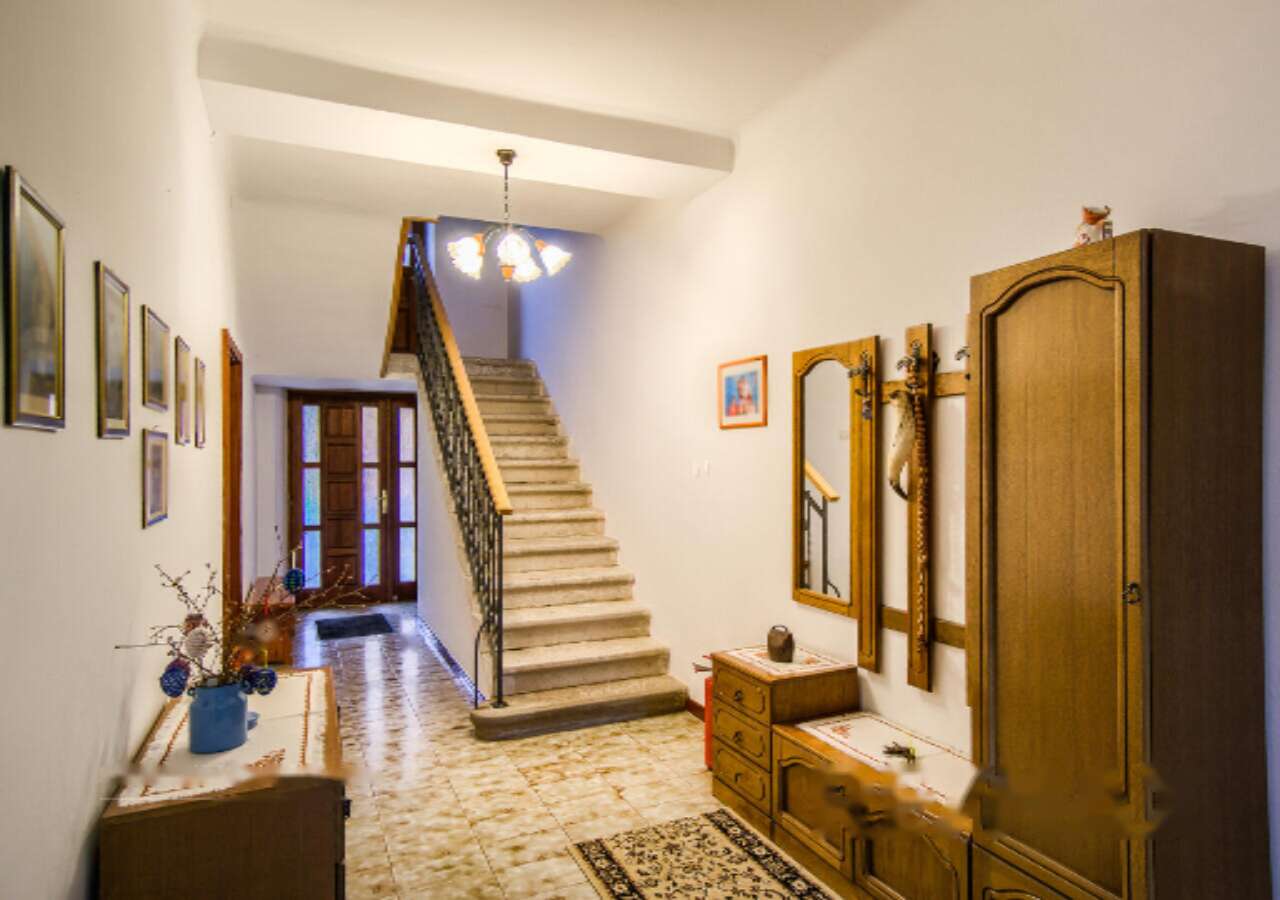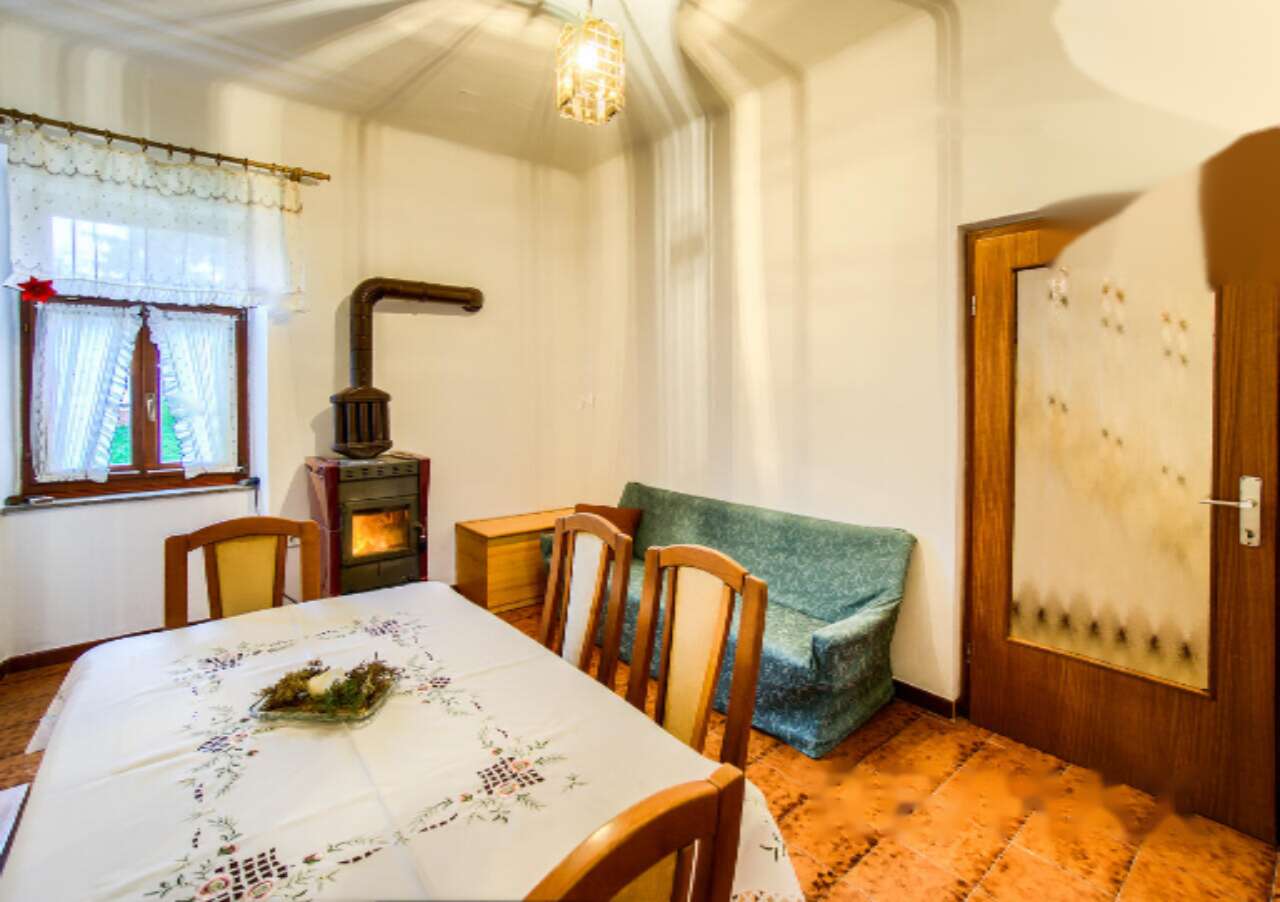 Здание, выполненное в форме буквы "L", предлагает просторные внутренние помещения с высокими потолками, включающие жилые зоны и помещения для аграрной деятельности. На первом этаже располагаются прихожая, кухня с обеденной зоной, гостиная и пространство для отдыха. Второй этаж включает в себя две просторные спальни и санузел. Чердак оборудован для использования. Отопление обеспечивается за счет электроконвекторов и печного оборудования на твердом топливе.