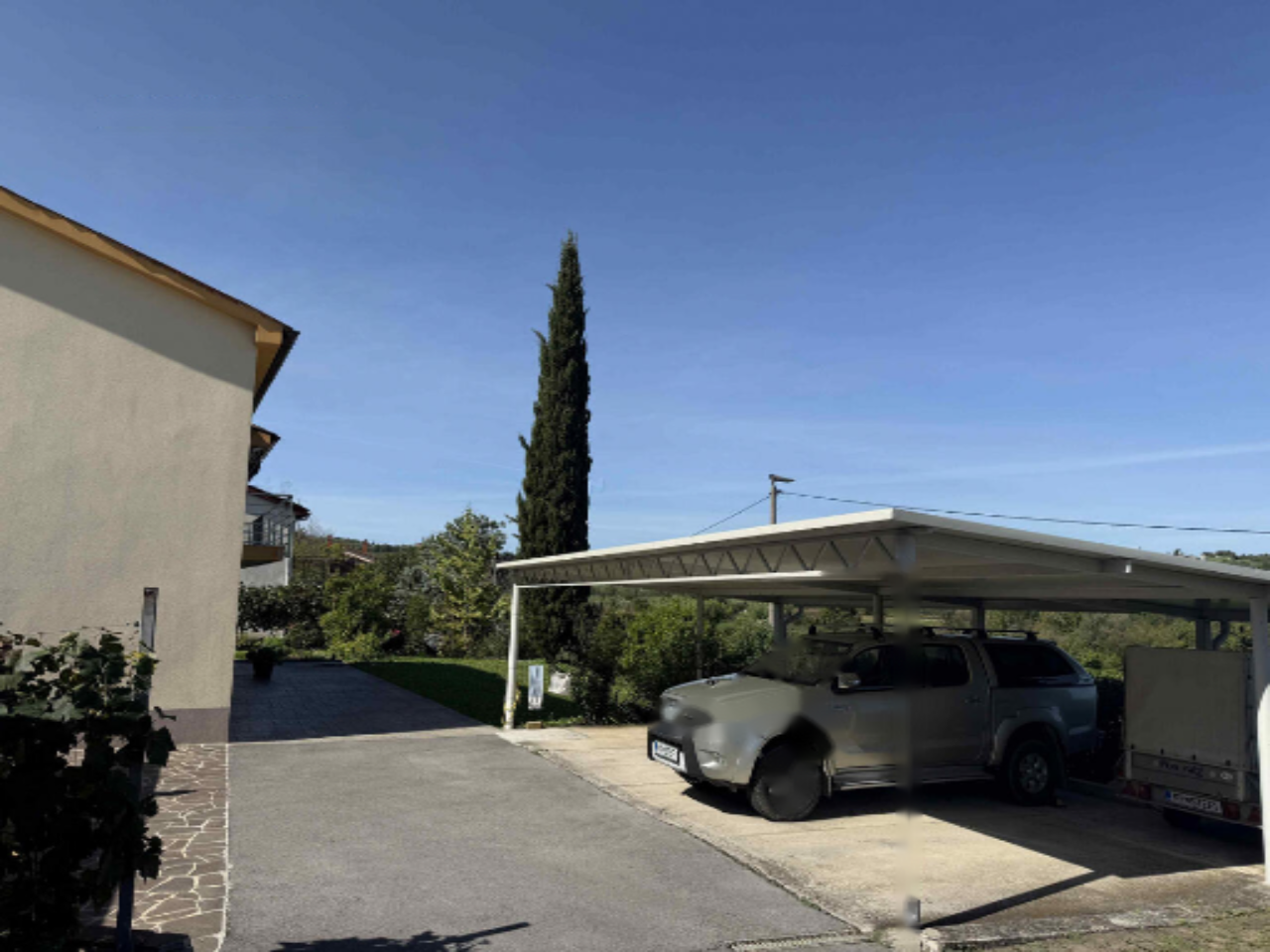 Для владельцев предусмотрены три крытых парковочных места, гараж, превращенный в летнюю кухню, и сопредельная кладовая, а также небольшой склад с внешним санузлом и душем. Обширный участок площадью 900 м² включает половину двора с зелеными лужайками и небольшим садиком, где можно выращивать овощи и зелень.