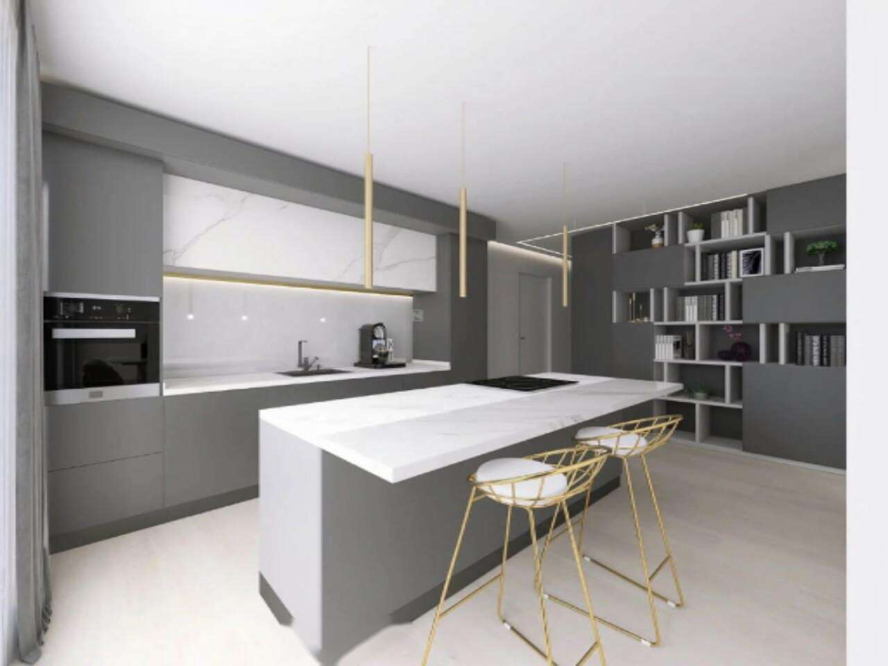 Эта квартира разместилась на третьем из пяти этажей здания и обладает общей площадью 135,7 м², включая впечатляющую террасу размером 21,4 м². Световые и объемные пространства с большими стеклянными окнами наполняют дом уютом и открытостью, соединяя с внешним миром. В помещениях общей площадью 111 м² расположены прихожая, кухня, гостиная, два кабинета, спальная комната, ванная, отдельный туалет, подсобка и коридор.