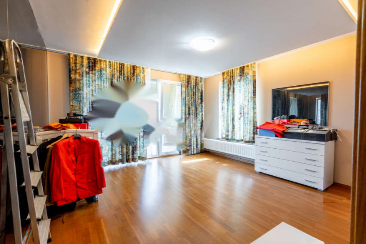 На первом этаже расположены семь комнат, включая просторный зал, ванную, сауну на шестерых, небольшую комнату, кладовую, офис, котельную и коридор. Второй этаж включает семь помещений: кухню с обеденной зоной, гостиную с выходом на балкон, просторную комнату с туалетом, кладовую, прачечную, вместительный балкон, отдельный туалет и коридор. На третьем этаже размещено восемь помещений: квартира с отдельным входом, большая комната, ванная, спальня с балконом, туалет, большая ванная с гидромассажной ванной, гардеробная, просторная комната с балконом и ванной, детская комната и коридор.