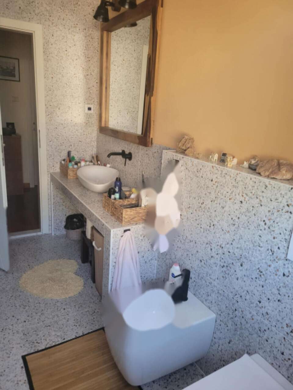 На высоком первом этаже можно найти пятикомнатную квартиру с прихожей, входом, коридором, туалетом и центральным помещением с кухней, столовой и гостиной, откуда открывается доступ на террасу.