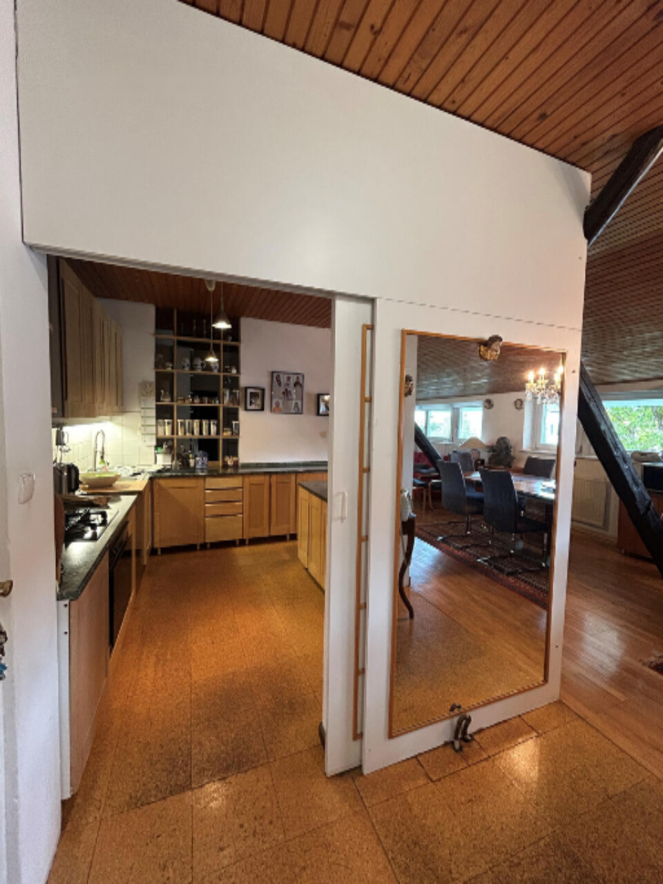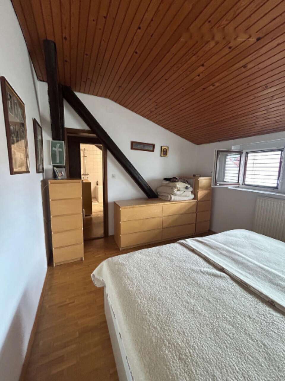 Интерьеры тщательно продуманы: просторная гостиная, совмещённая с обеденной зоной, seamlessly переходит в современную кухню. Комфорта добавляет гардеробная и просторная ванная комната с окном. Несмотря на отсутствие лифта, большое количество мансардных окон приносит в дом обильный дневной свет.
