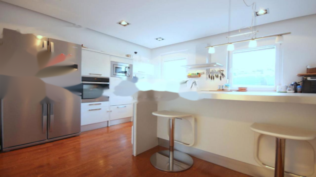 На первом этаже расположены: вход, просторная кухня, кладовая и большая гостиная с камином, из которой можно выйти на солнечную террасу около 40 м² с барбекю-зоной. Здесь также находится одна из двух ванных комнат.