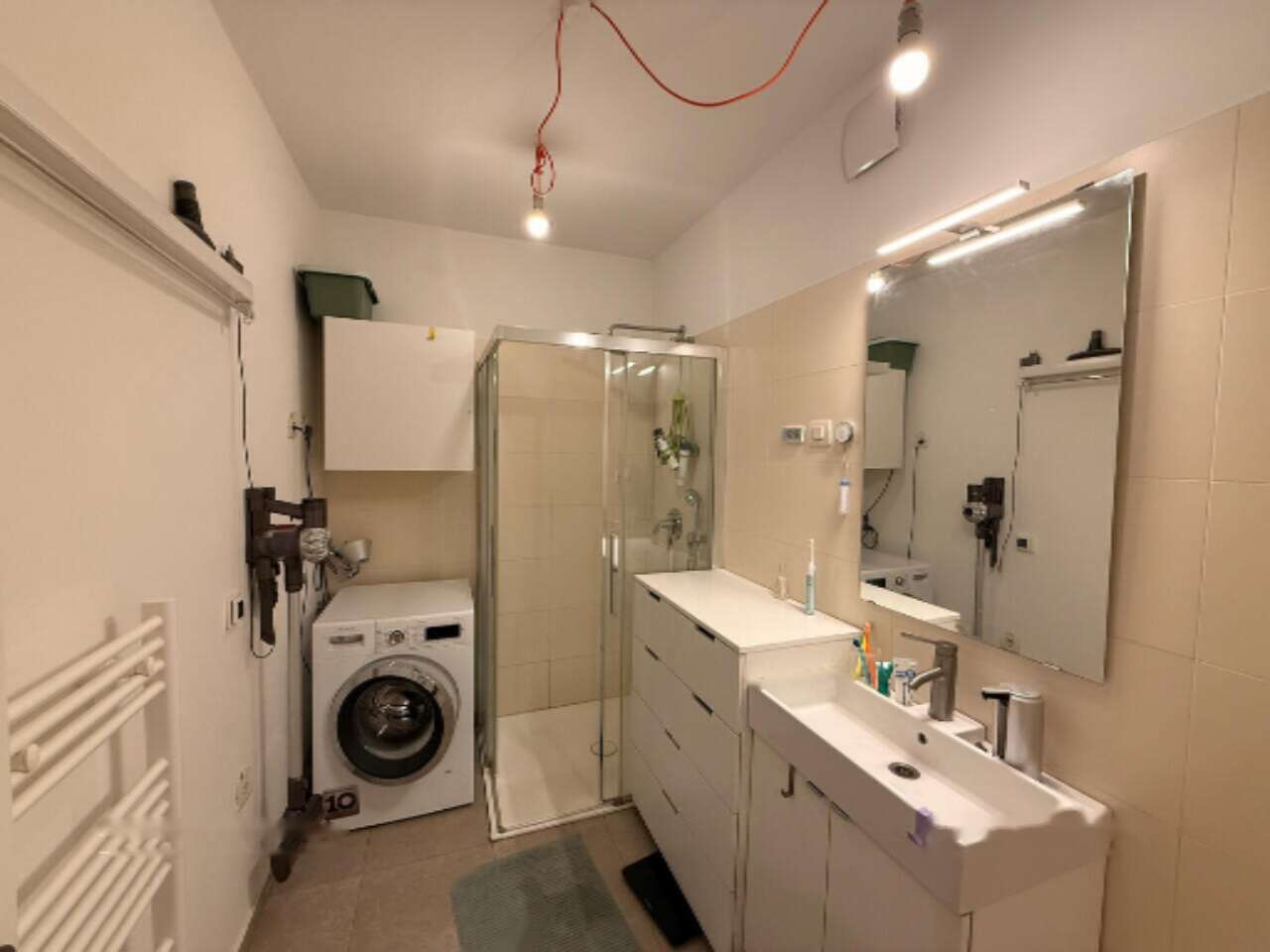 Квартира оборудована системой отопления на городском газе и современной кондиционирующей системой Mitsubishi, управляемой через приложение на телефоне. В ванной комнате установлена душевая кабина Disenia с литым мраморным поддоном и функцией электрического подогрева пола.