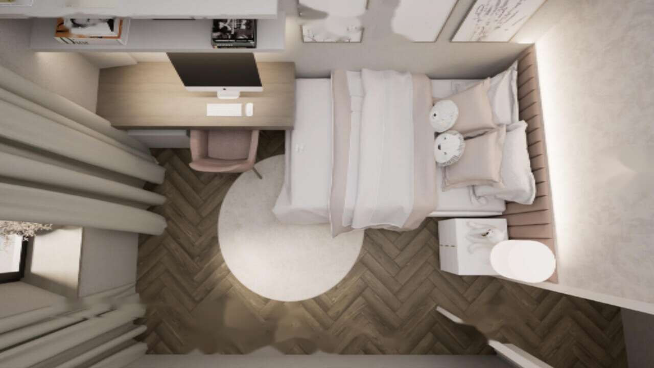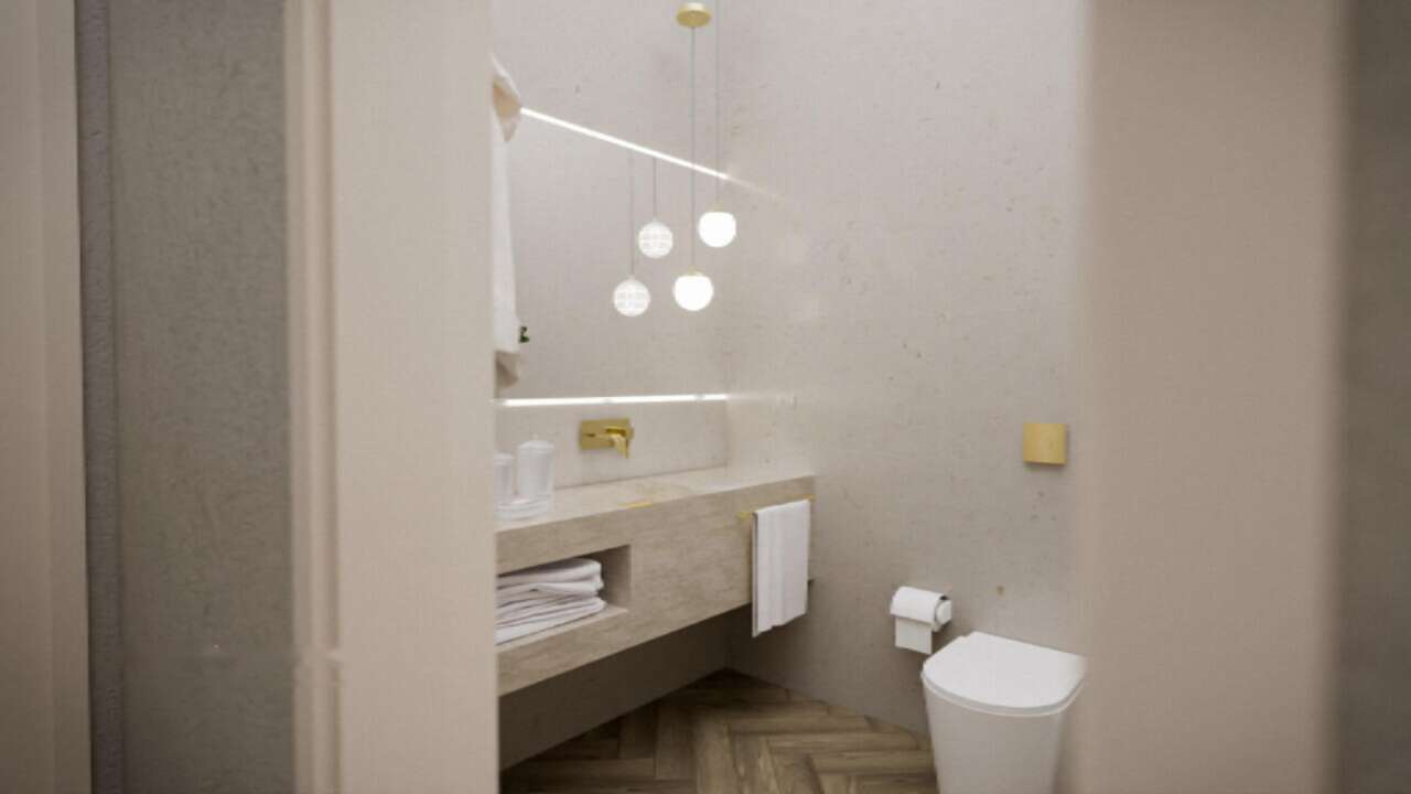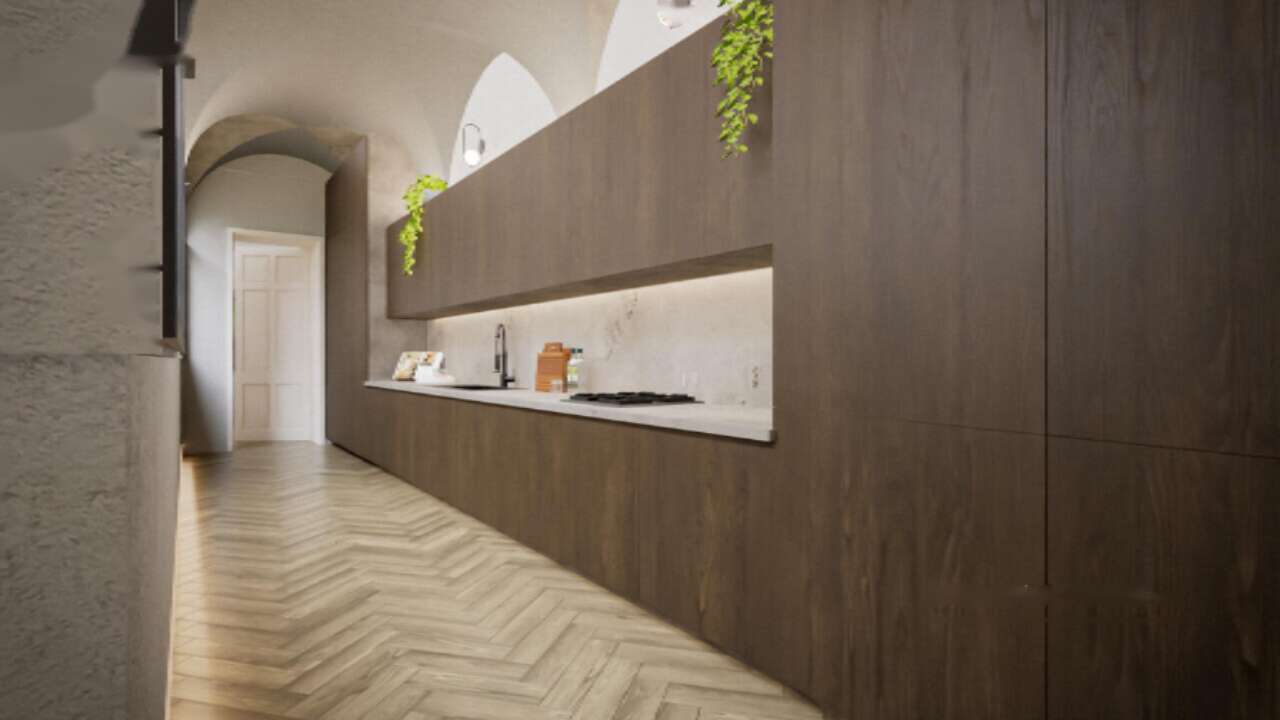 Общий метраж составляет 160,6 м² и позволяет полностью персонализировать интерьер, выбирая, например, напольные покрытия. Планировка гибкая и адаптивная: можно использовать пространство как единое жилище или разделить на две самостоятельные квартиры. Внутренний стеклянный атриум оформлен новыми деревянными окнами. Пространство вокруг атриума, украшенное арочными коридорами с каменными колоннами и акцентной подсветкой, плавно переходит в жилую зону, делая её светлой и просторной.