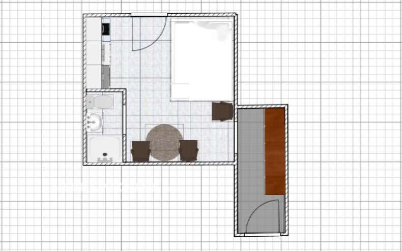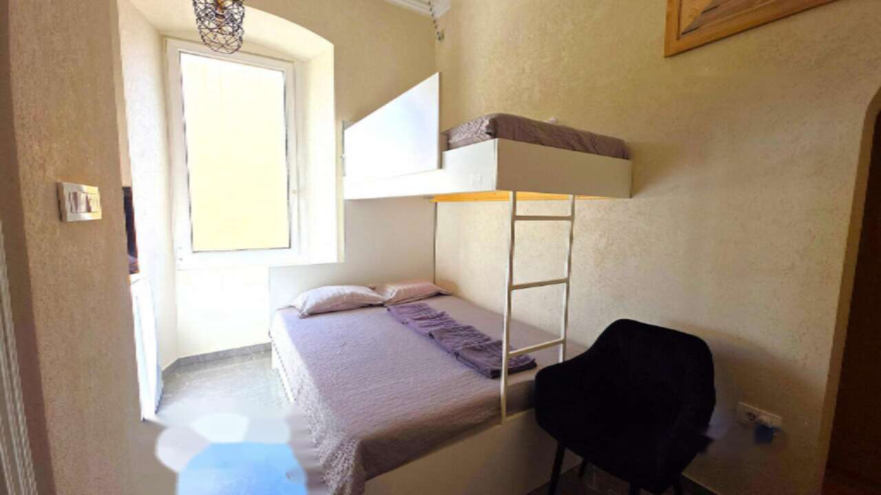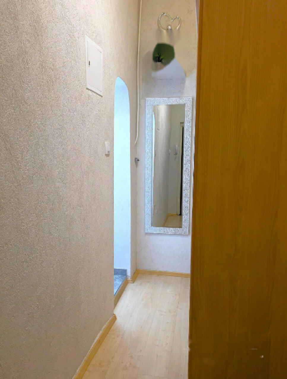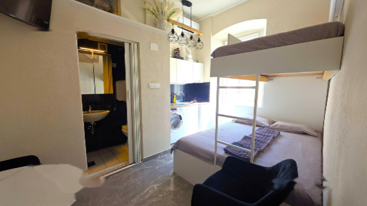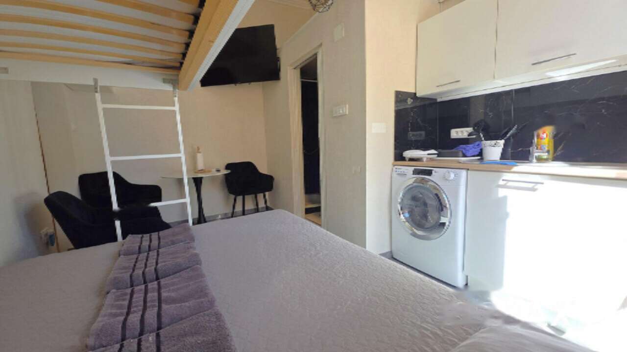 Квартира площадью 17,5 м² расположена на втором этаже трёхэтажного здания. Высокие потолки и окна с регулирующимися жалюзи добавляют интерьеру лёгкость и свет. Внутреннее пространство полностью обставлено мебелью и оснащено современной бытовой техникой, включая электрическое отопление и кондиционер.
