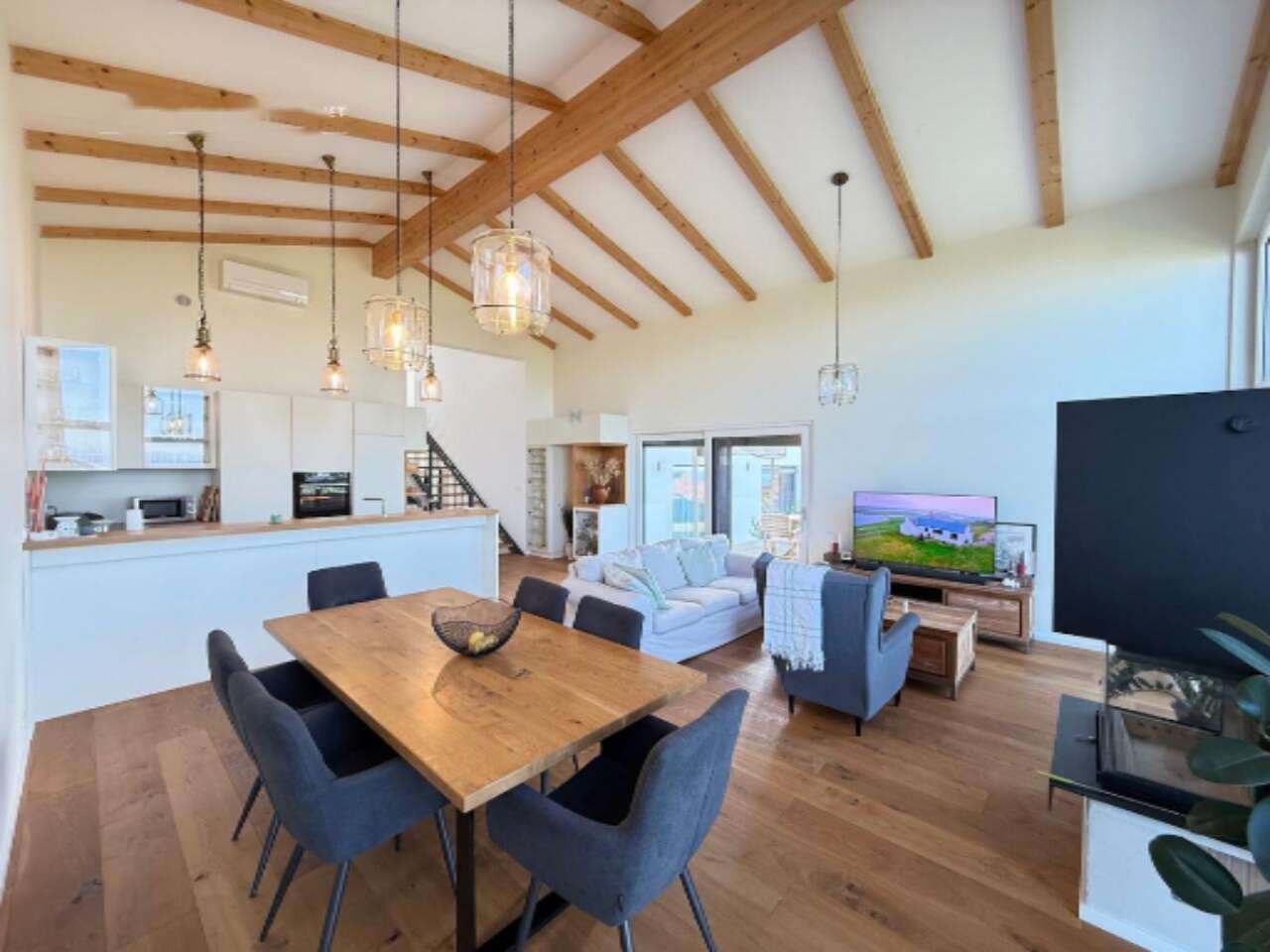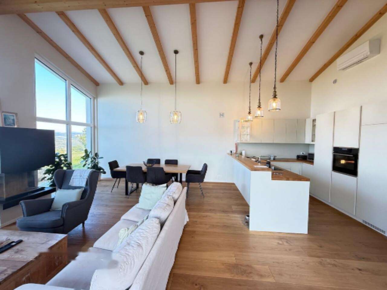 Система отопления и охлаждения дома реализована на базе теплового насоса, что обеспечивает экономичное использование ресурсов и сниженные эксплуатационные издержки. В гостиной установлен уютный камин, а на полах уложен высококачественный дубовый паркет. Полностью обустроенная кухня с изящным кухонным островом добавляет комфорт и стиль к этому дому.