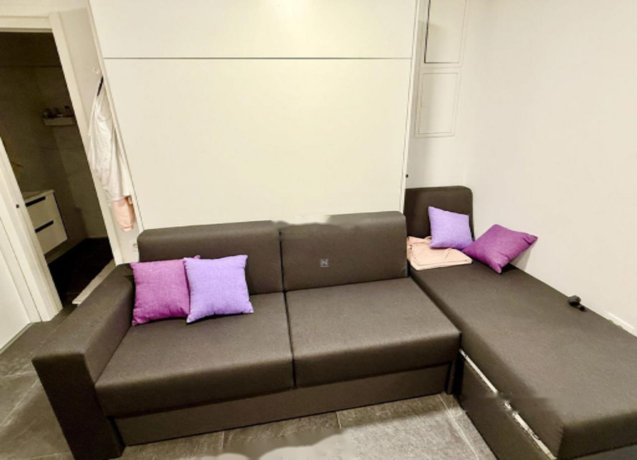 Кухня оборудована всей необходимой бытовой техникой, включая плиту с духовкой, вытяжку, холодильник и посудомоечную машину. В зоне отдыха имеются встроенный шкаф для одежды, тумба под телевизор, стиральная машина и диван-кровать, который можно сложить в шкаф для экономии пространства.