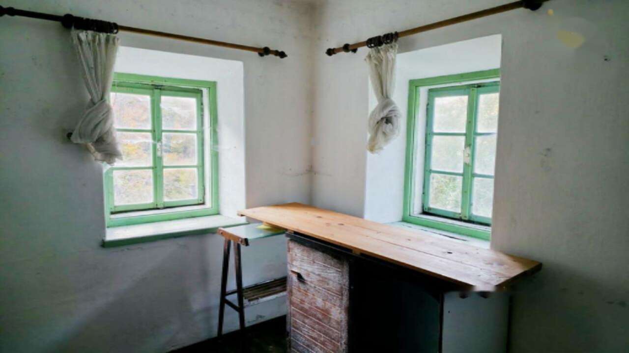 В окружении лугов и лесов расположен восхитительный каменный дом, возведенный в 1928 году. Он требует ремонта, но подключен к электросети и имеет источник питьевой воды. Просторная планировка здания распределена на четыре уровня: подвал, первый и второй этажи, а также мансарда.