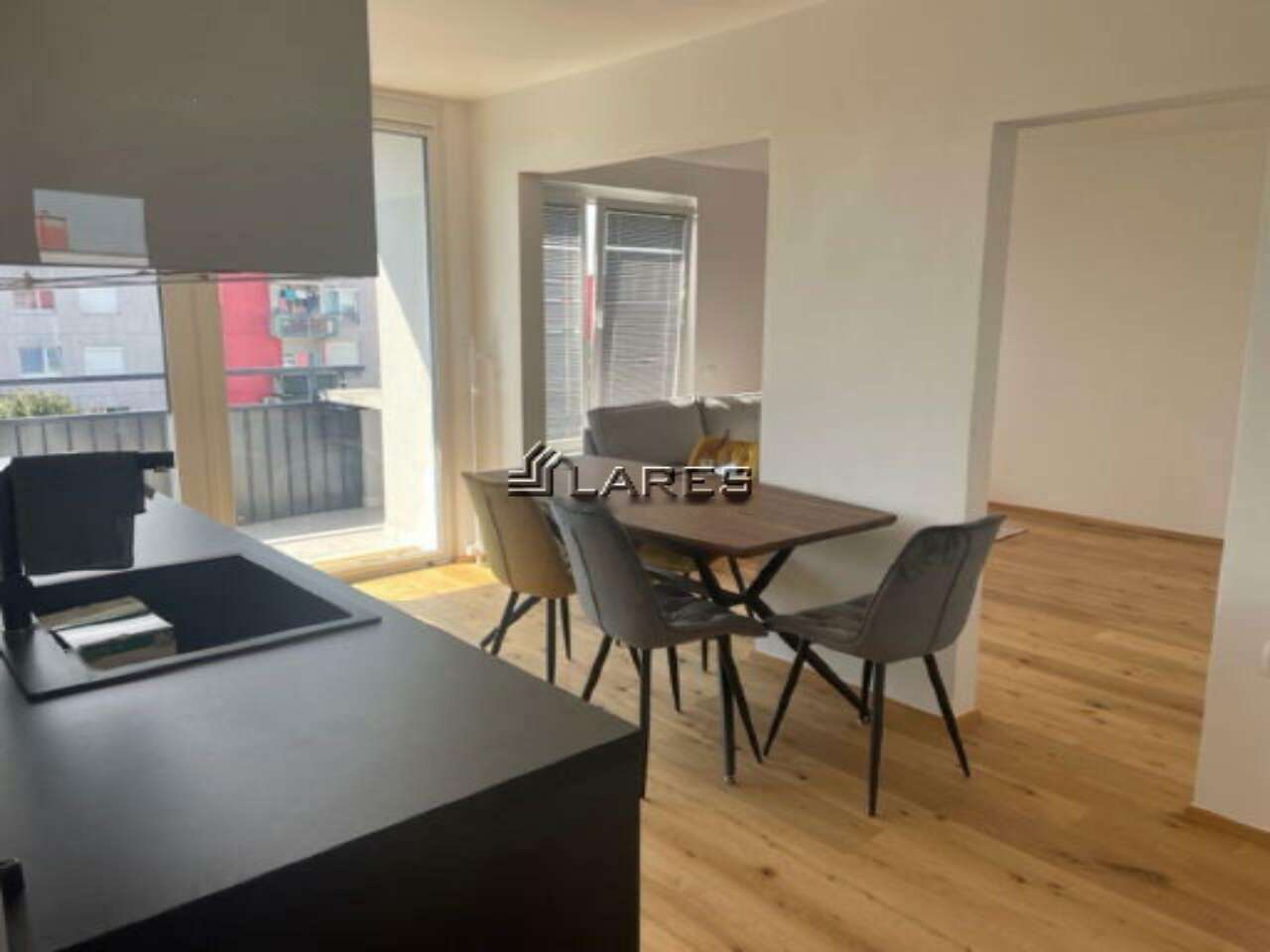 С балкона раскрывается потрясающий вид на зеленый парк, расположенный под домом, а также на Люблянский замок и Альпы, что для городской среды является настоящей редкостью.