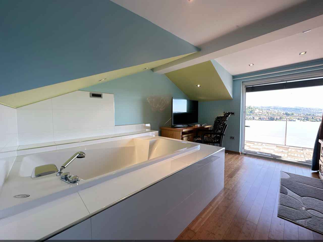 - Мансарда (третий этаж): главная спальня с джакузи, небольшая ванная с туалетом, терраса с чудесным видом на море.