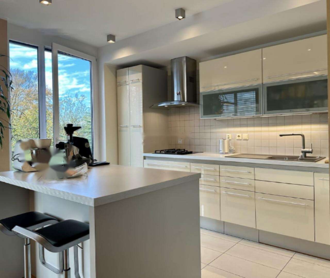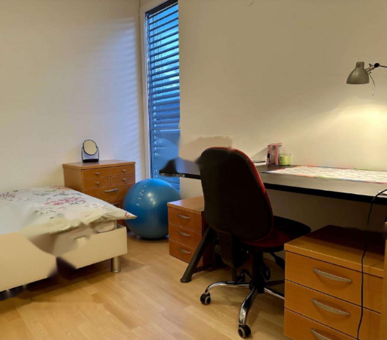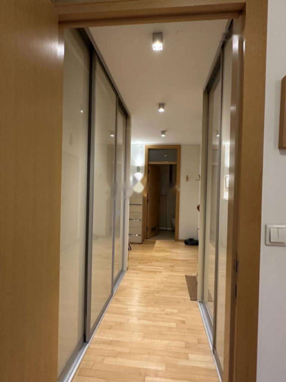 В квартире удобно разместились кухня, гостиная, столовая, отдельный туалет для гостей, четыре спальни, просторная ванная комната с ванной, двумя умывальниками и душем, а также хозяйственное помещение. Объект включает внешнюю закрытую гаражную постройку, парковочное место перед гаражом и кладовую с доступом через гараж.