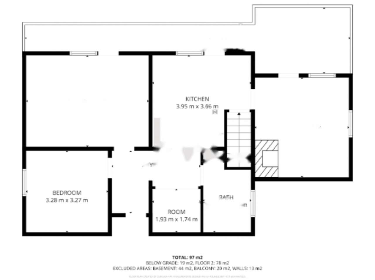 На первом этаже располагаются пищевой цех, дровяной склад и подвал. Из кухни возможно выйти на балкон, а также на обширную террасу площадью 21 м², созданную для наслаждения солнечными лучами. Наверху, на втором этаже, строятся две мансардные комнаты.