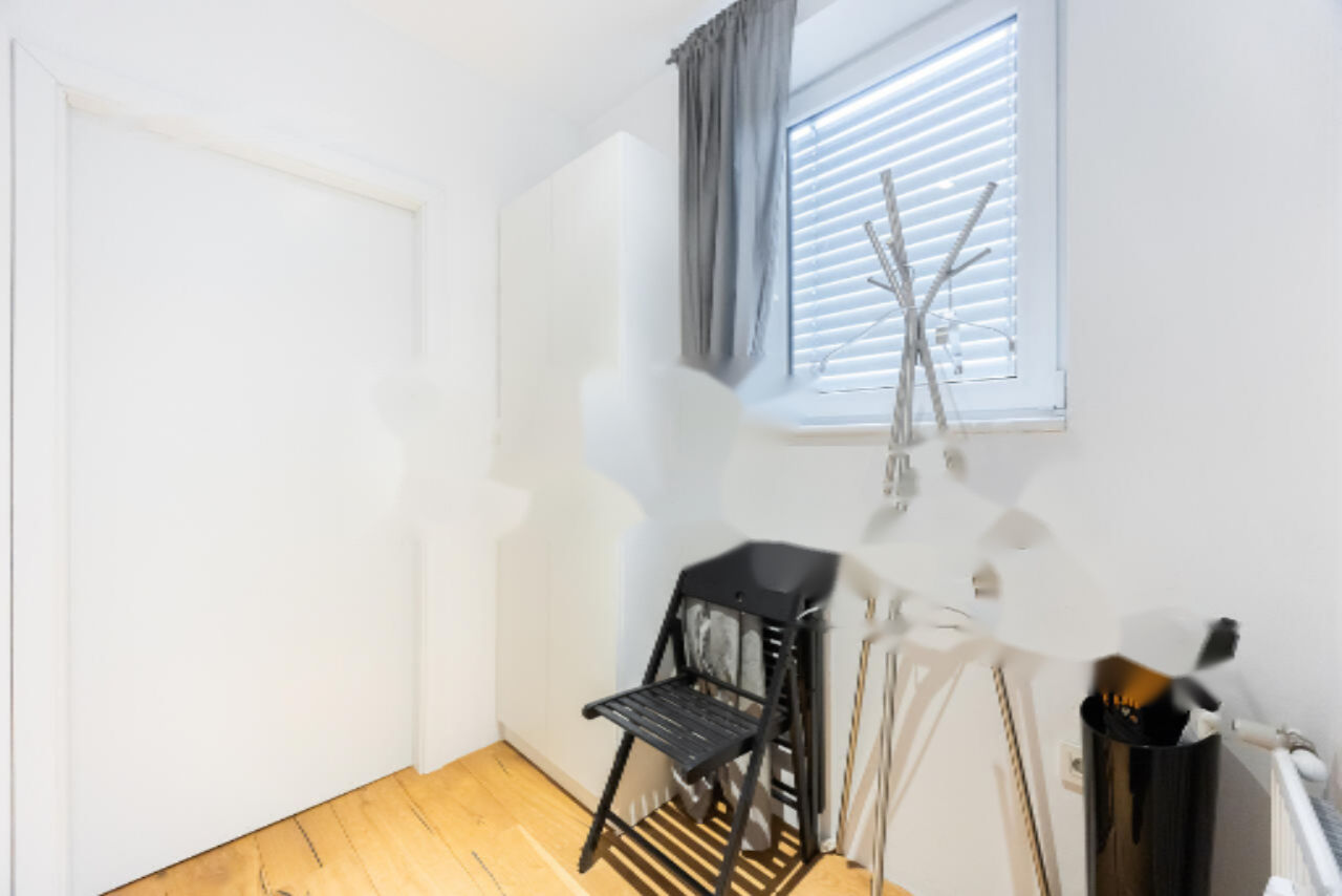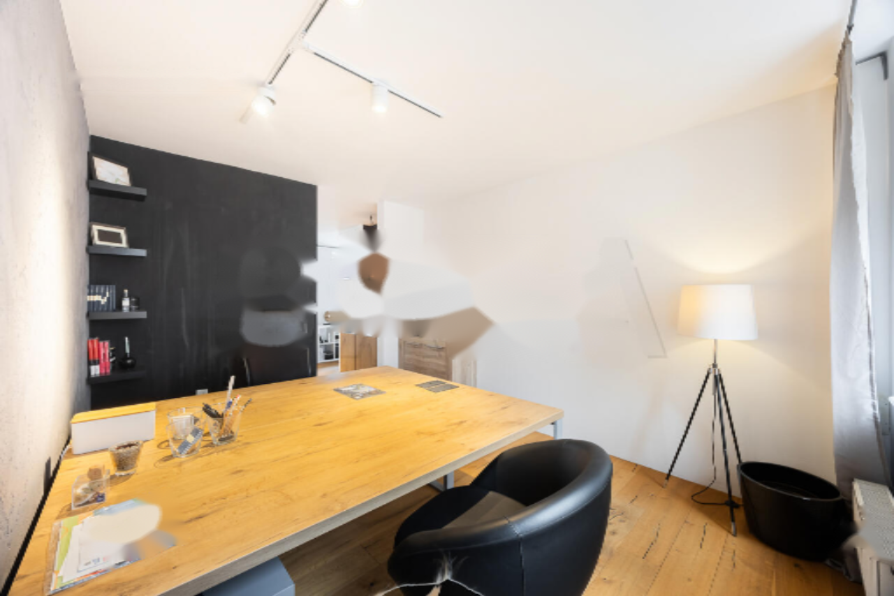 Помещение, ориентированное на восток-запад, включает в себя небольшой входной холл и просторную открытую зону, частично разделенную на офис и место для встреч с мини-кухней. На этаже имеются раздельные санузлы для мужчин и женщин, используемые совместно с другими арендаторами.