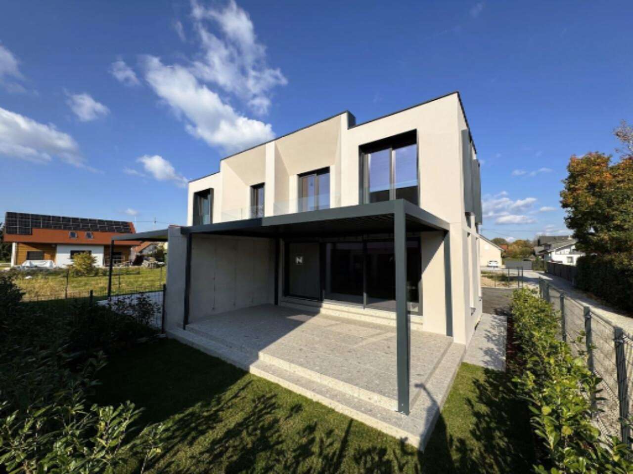 Вокруг дома расположен ухоженный атриум с террасой, оборудованной биоклиматической перголой; дорожки выложены керамической плиткой, путь к дому заасфальтирован, а участок защищен панельным забором.