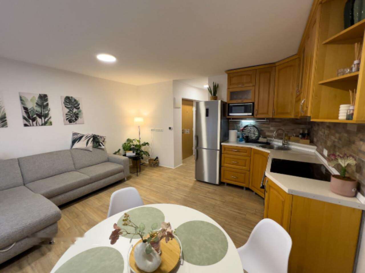 В квартире обустроена современная гостиная, объединенная с кухонной зоной и столовой, а также имеется уютная спальня, ванная комната с душем и прихожая. Дополнительно предусмотрено место для хранения размером 3,4 м². Обладатели квартиры по достоинству оценят удобное парковочное место перед домом и небольшой садик.