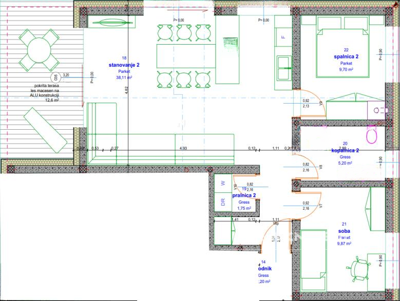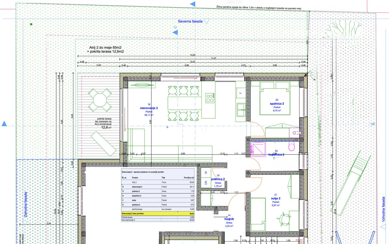 Квартира отличается просторной планировкой, включая две спальни, ванная комната, гостиная и кухня. Для вашего удобства предусмотрены два парковочных места: одно в подземном гараже и одно снаружи, а также крытая терраса и зеленый двор. Квартира полностью адаптирована для лиц с ограниченными возможностями, и у жильцов есть доступ к общим комнатам для хранения велосипедов.