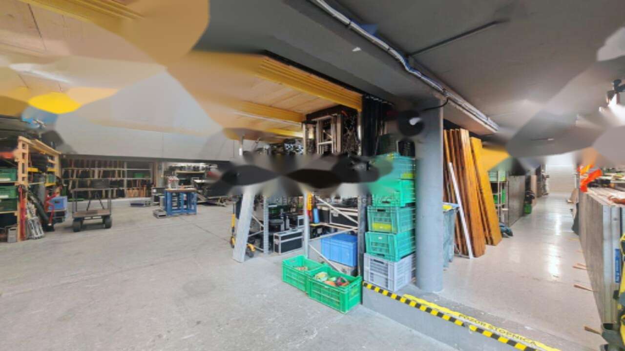 На первом уровне предусмотрены: входная зона с рецепцией, два удлиненных складских помещения — одно из которых переходит в офисное пространство, а другое — в удобный склад. Кроме того, представлены кухня, три санузла, два многофункциональных офиса и несколько складских помещений. Цокольный этаж доступен как через внутреннюю лестницу, так и через внешнюю крытую рампу, позволяющую проезд грузовикам весом до 18 тонн. Вокруг здания организовано круговое движение для фургонов и меньших грузовиков.