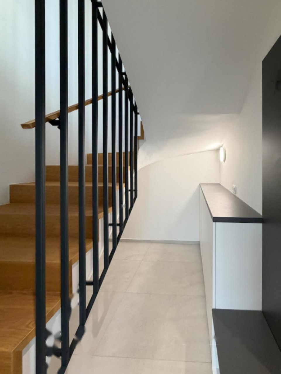 На первом уровне находится входная группа с лестницей. Второй этаж оборудован двумя детскими комнатами с встроенными шкафами, ванной с душевой и спальней с отдельной ванной комнатой (душ + ванна) и гардеробной со встроенными шкафами. Третий уровень занимает просторная жилая зона, совмещающая кухню с кухонным островом, столовую и гостиную с выходом на обширную террасу размером 25 м², а также кладовую.