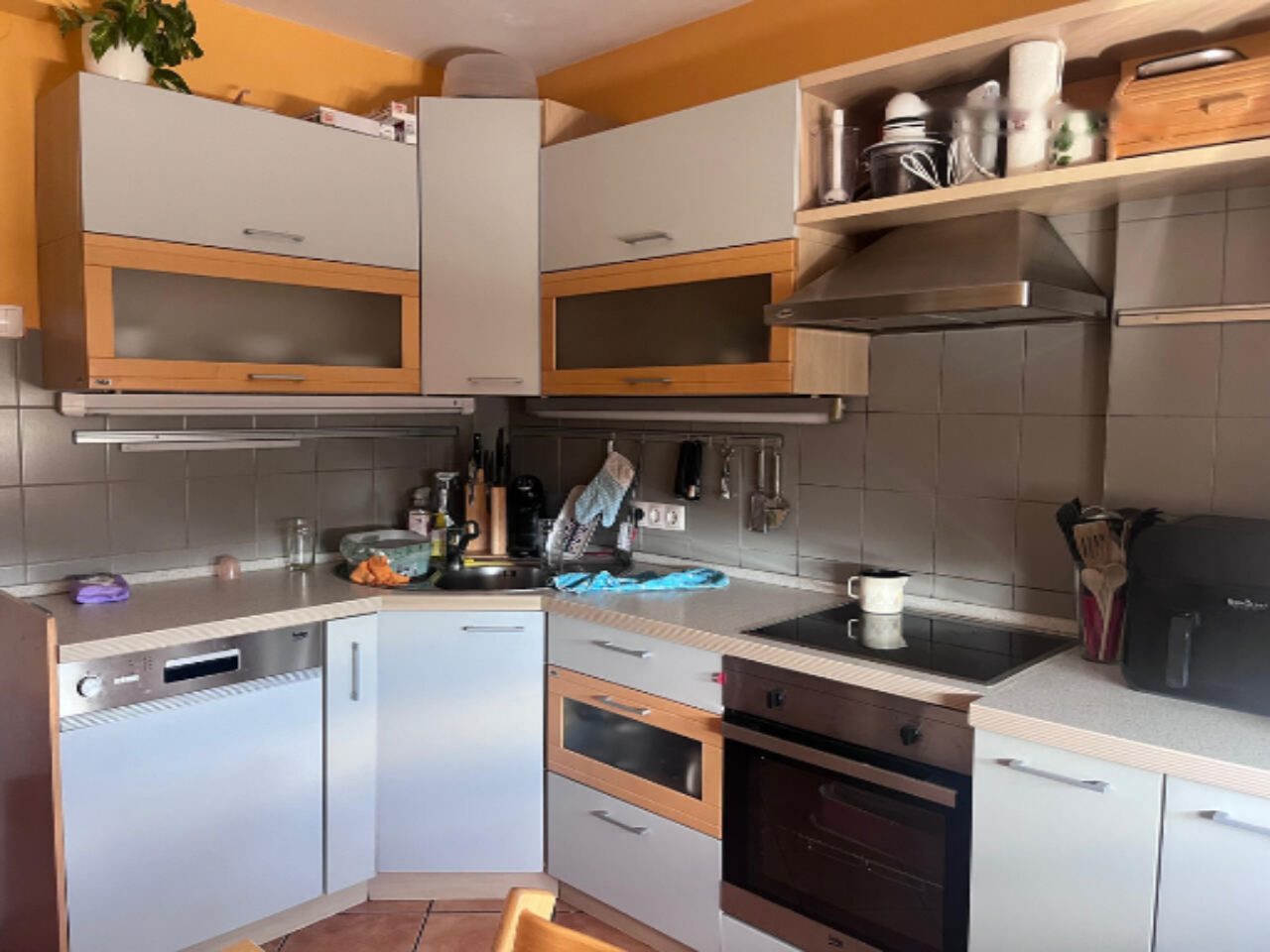- Кухня, обставленная всей необходимой техникой, включая холодильник, посудомоечную машину и плиту, и предоставляющая обеденный стол, рассчитанный на 4-6 персон. Из окна кухни виден Люблянский град