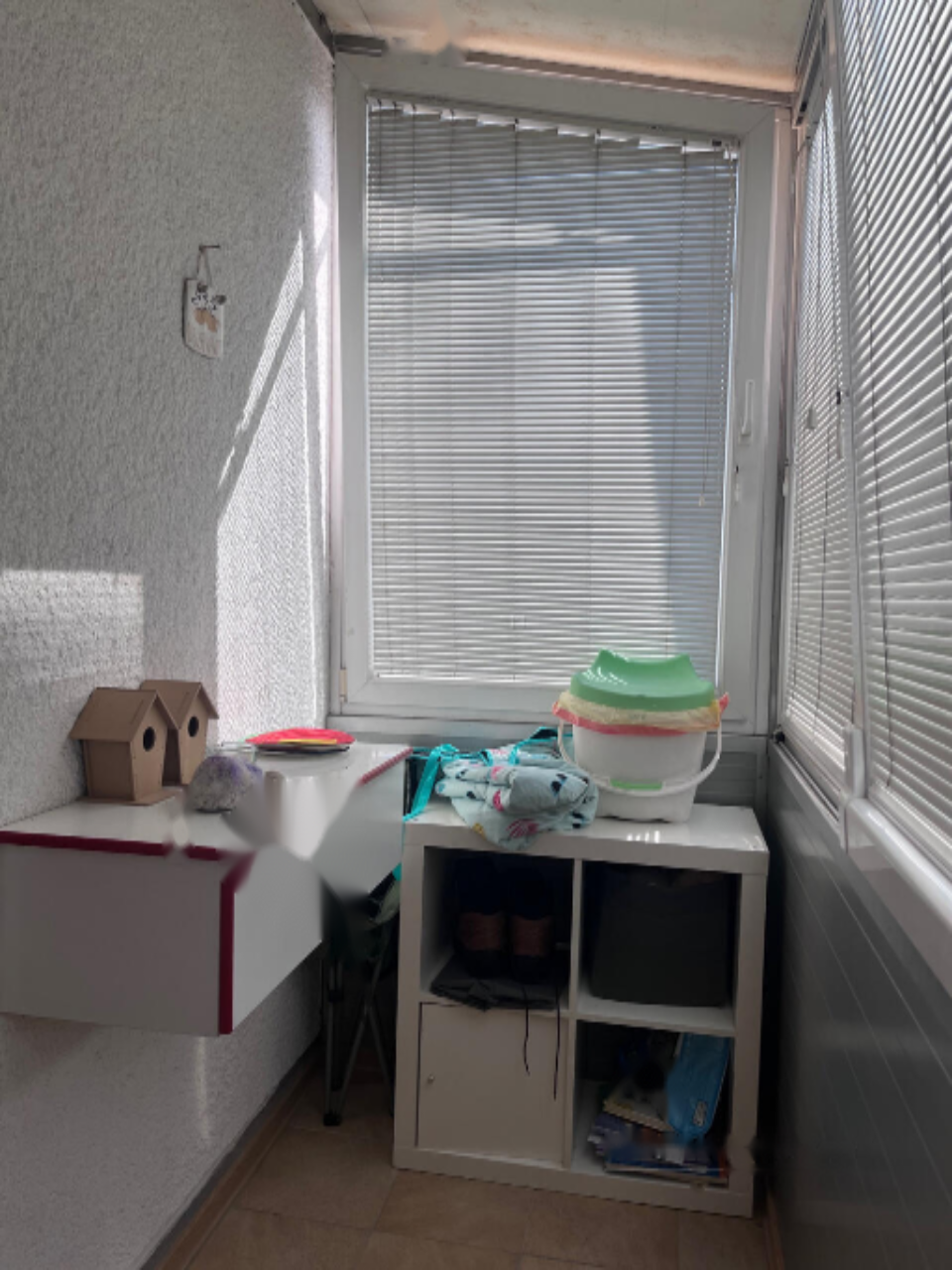 - Застеклённый балкон оснащён высоким столиком и полочками для удобства