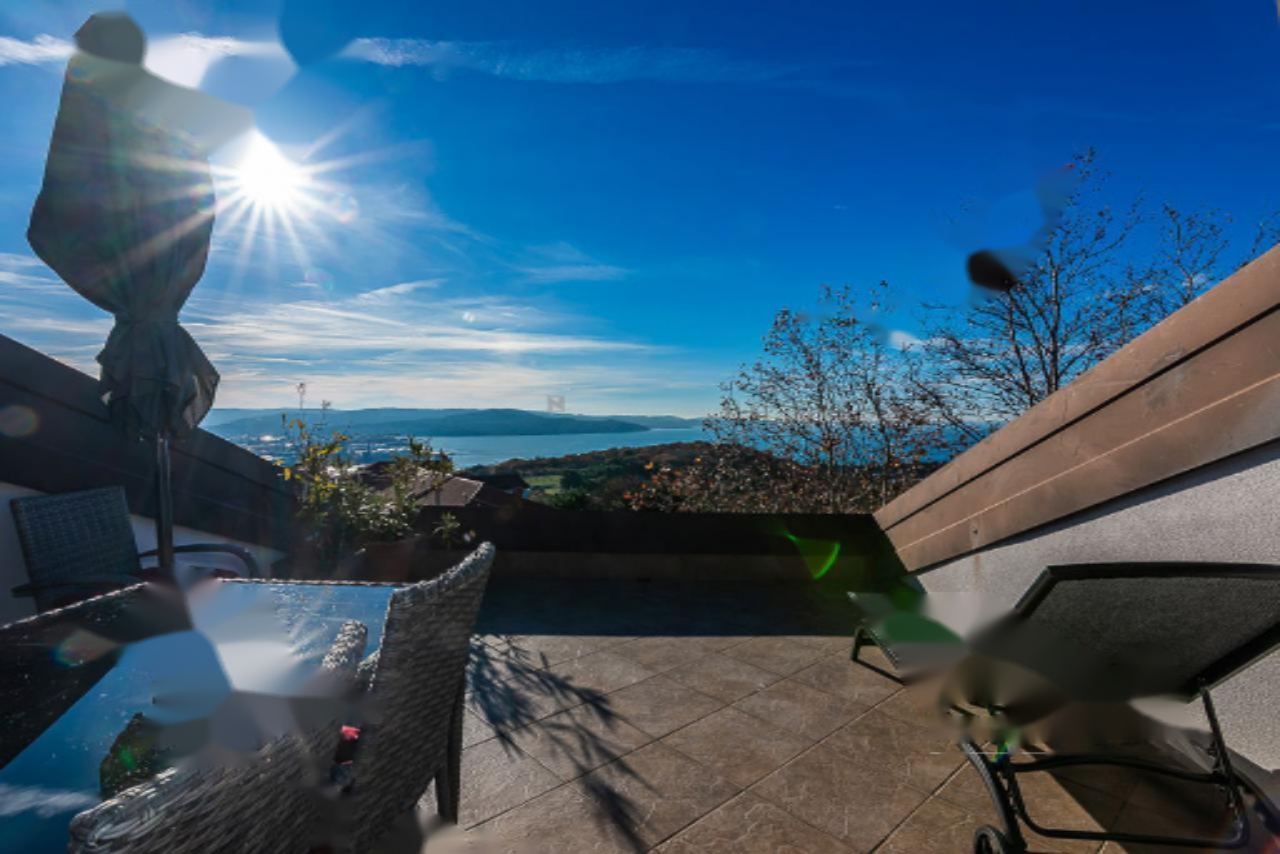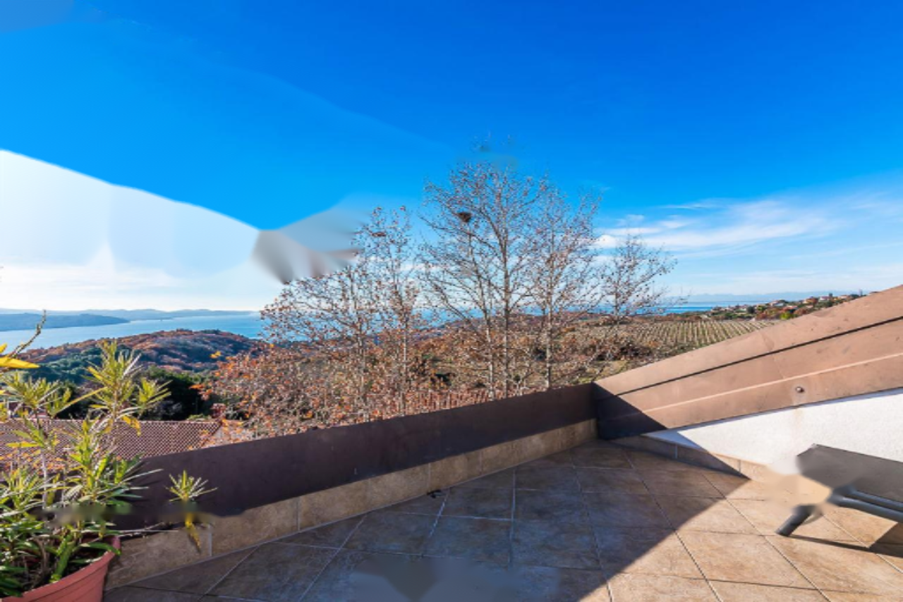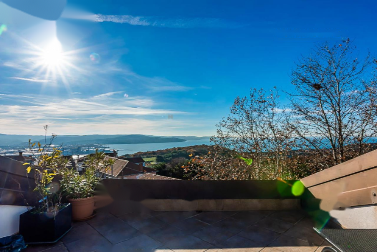 На продажу выставлена великолепная двухуровневая квартира с изумительным панорамным видом на море, находящаяся в живописном районе Хрватини недалеко от Копера. Этот объект недвижимости предлагает тщательно продуманное и уютное пространство, идеально подходящее для комфортной жизни. Квартира размещается на втором этаже и включает три спальни, светлую гостиную, полную мансарду и террасу площадью 21 м².