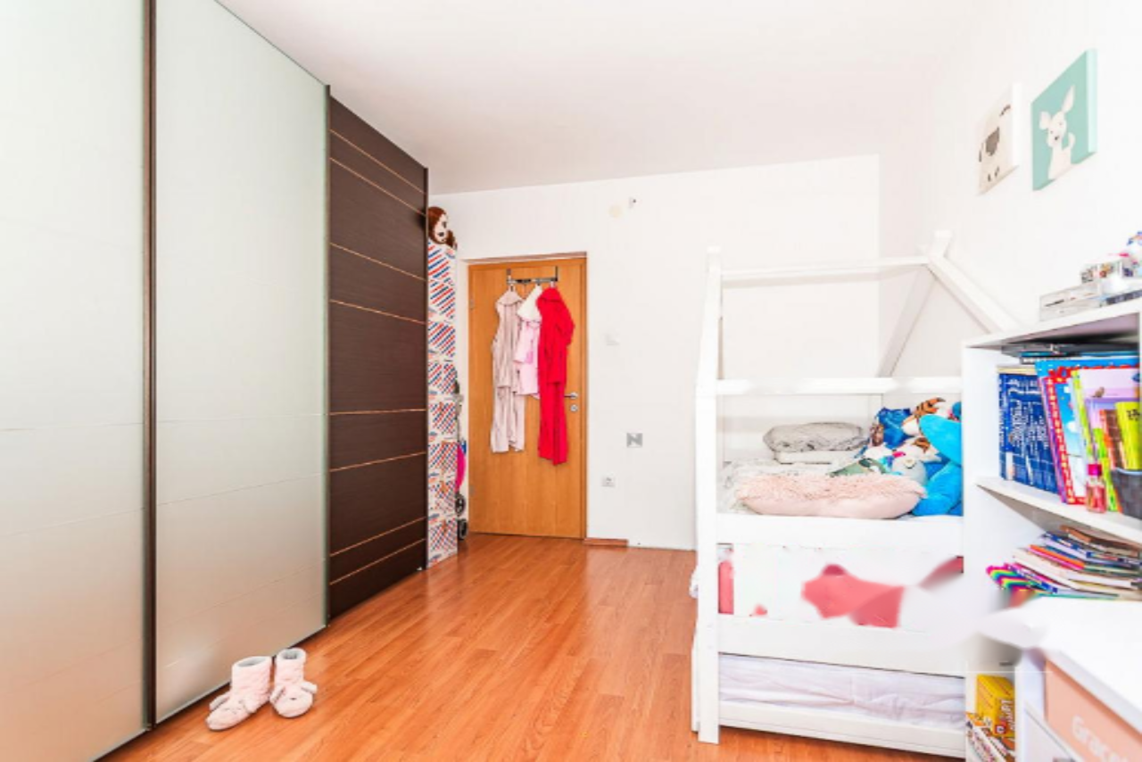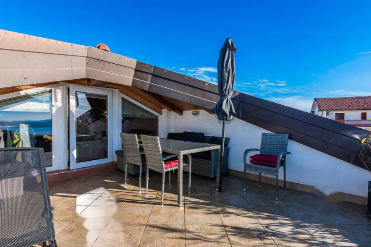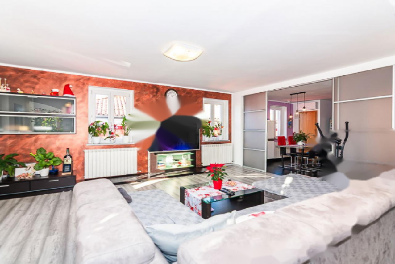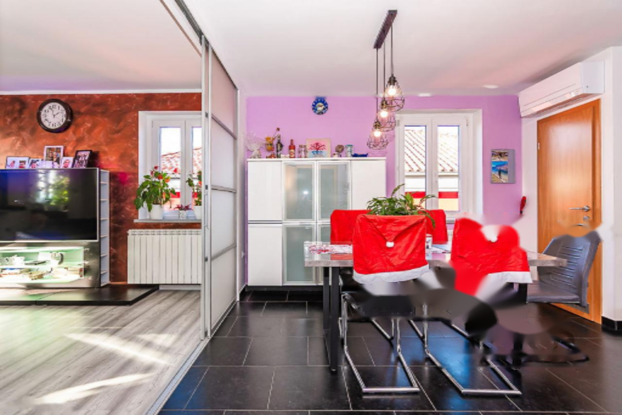 На продажу выставлена великолепная двухуровневая квартира с изумительным панорамным видом на море, находящаяся в живописном районе Хрватини недалеко от Копера. Этот объект недвижимости предлагает тщательно продуманное и уютное пространство, идеально подходящее для комфортной жизни. Квартира размещается на втором этаже и включает три спальни, светлую гостиную, полную мансарду и террасу площадью 21 м².