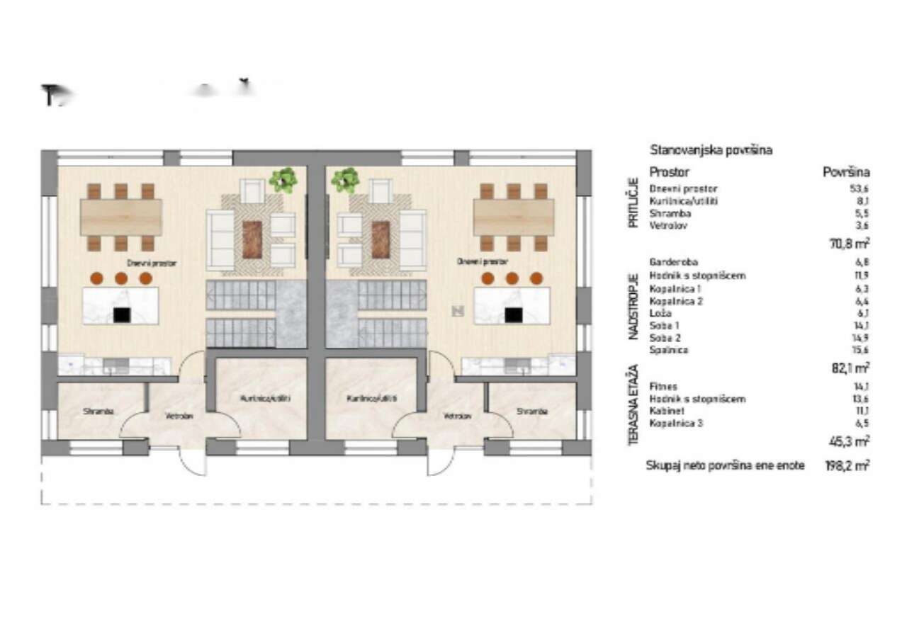 Дом делится на три уровня: первый этаж, второй этаж и террасу. Общая площадь одного блока составляет 198,2 м². Вас порадует собственный участок размером 263 м², на котором размещены строительная площадка, лужайка, два парковочных места и двор с подъездной дорожкой, что обеспечивает удобное проживание.