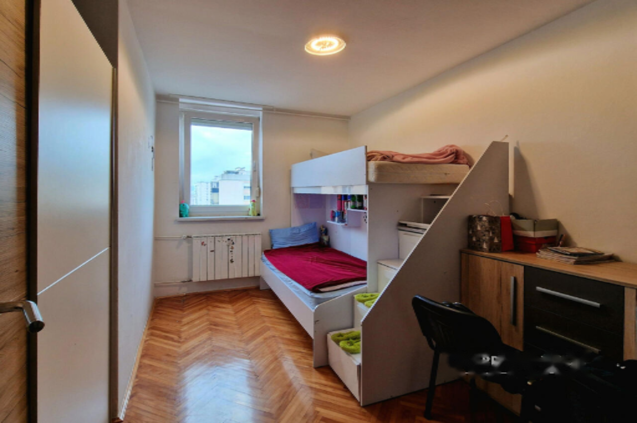 Продается просторная трехкомнатная квартира в районе Мосте, Любляна, на улице Кайухова. Жилье расположено на одиннадцатом уровне двенадцатиэтажного дома, возведенного в 1965 году. Здание оборудовано лифтом и местом для велосипедов.