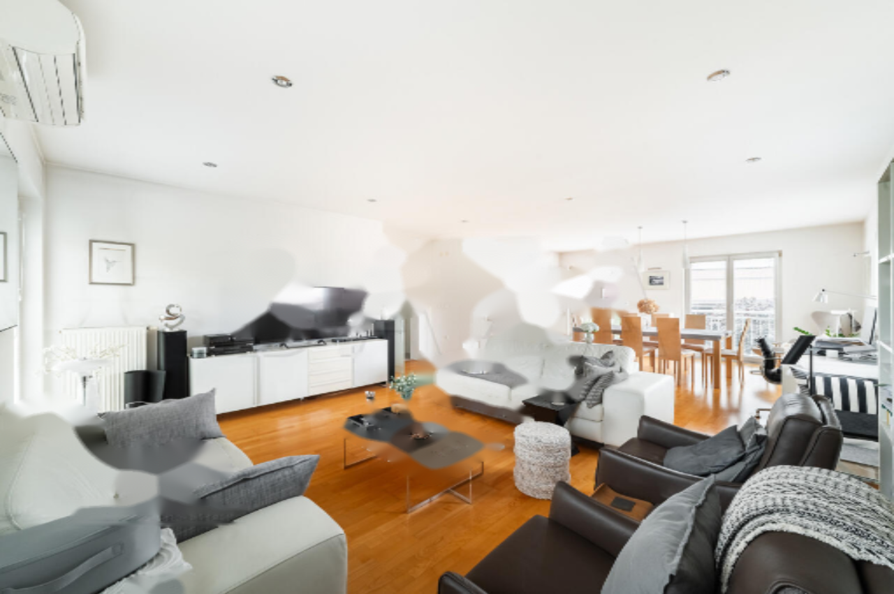 На первом этаже, площадью 144,8 м² (из них жилое пространство — 96,9 м²), находится первая квартира, в которой имеются две спальни (одна с выходом на балкон площадью 14 м²), ванная комната, кухня, столовая, гостиная и дополнительная многоцелевая комната. Также на этом уровне располагаются гараж (24,5 м²) и подвал (9,40 м²).