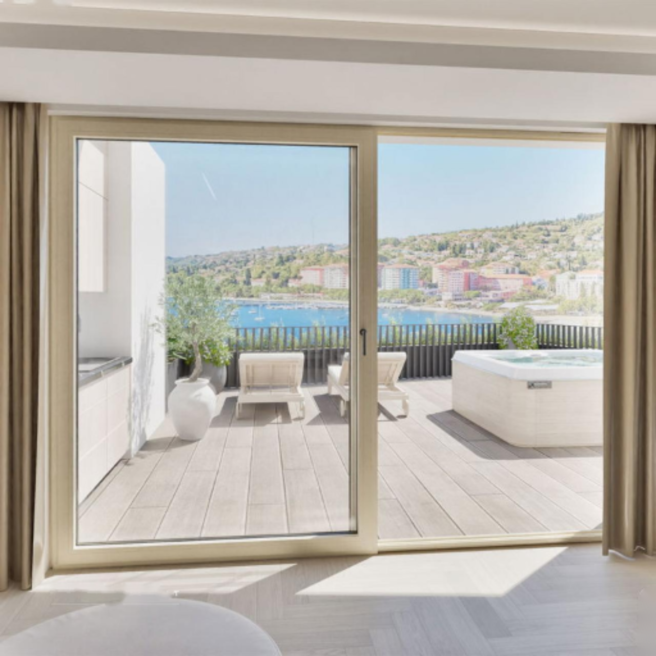 Расположенный в непосредственной близости от культового пляжа Порторожа, данный объект объединяет современный стиль и захватывающие морские панорамы. Ключевой особенностью является обширная терраса размером 34,50 м² и собственный зеленый атриум площадью 47,40 м², предоставляя все условия для отдыха на свежем воздухе. Апартамент освещается естественным светом благодаря большим стеклянным дверям, ведущим прямо на террасу.